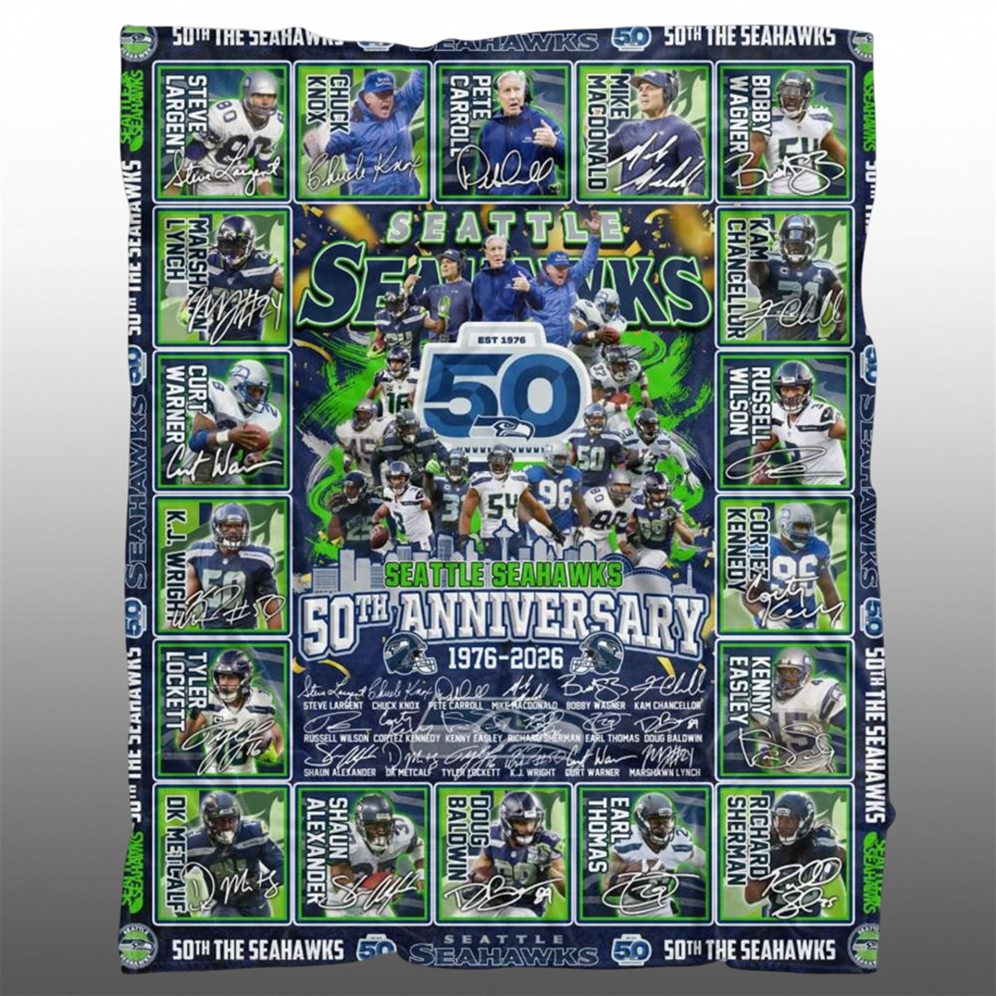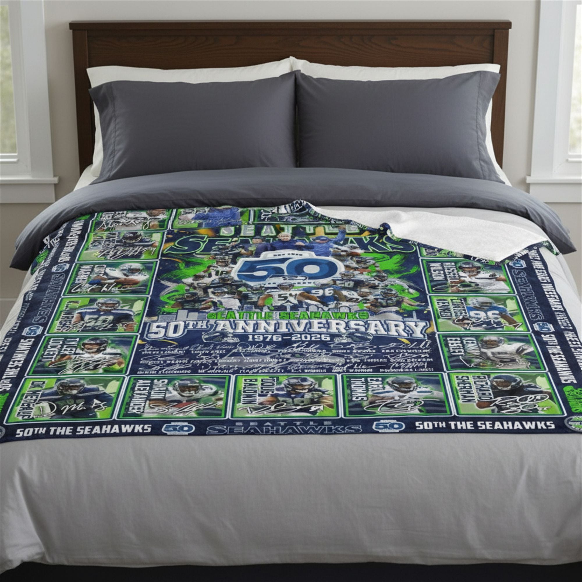The Seattle Seahawks 50th Anniversary Legends 1976 2026 Blanket is a masterfully designed tribute to one of the most passionate franchises. Spanning from the expansion year of 1976 to the upcoming 2026 golden anniversary, this blanket serves as a visual Hall of Fame for the true fan.