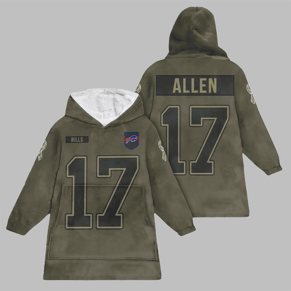 This blanket hoodie is engineered for maximum warmth and durability. In a stylish olive green, reminiscent of military-inspired “Salute to Service” gear, offering a unique and rugged look. Every detail is crafted to celebrate Bills football, from the bold number “17” and “BILLS” wordmark on the front to the iconic charging buffalo logo proudly displayed on the chest shield. The back completes the authentic jersey look with “ALLEN” and his number “17” in large, high-quality print, ensuring your favorite quarterback is represented from every angle.