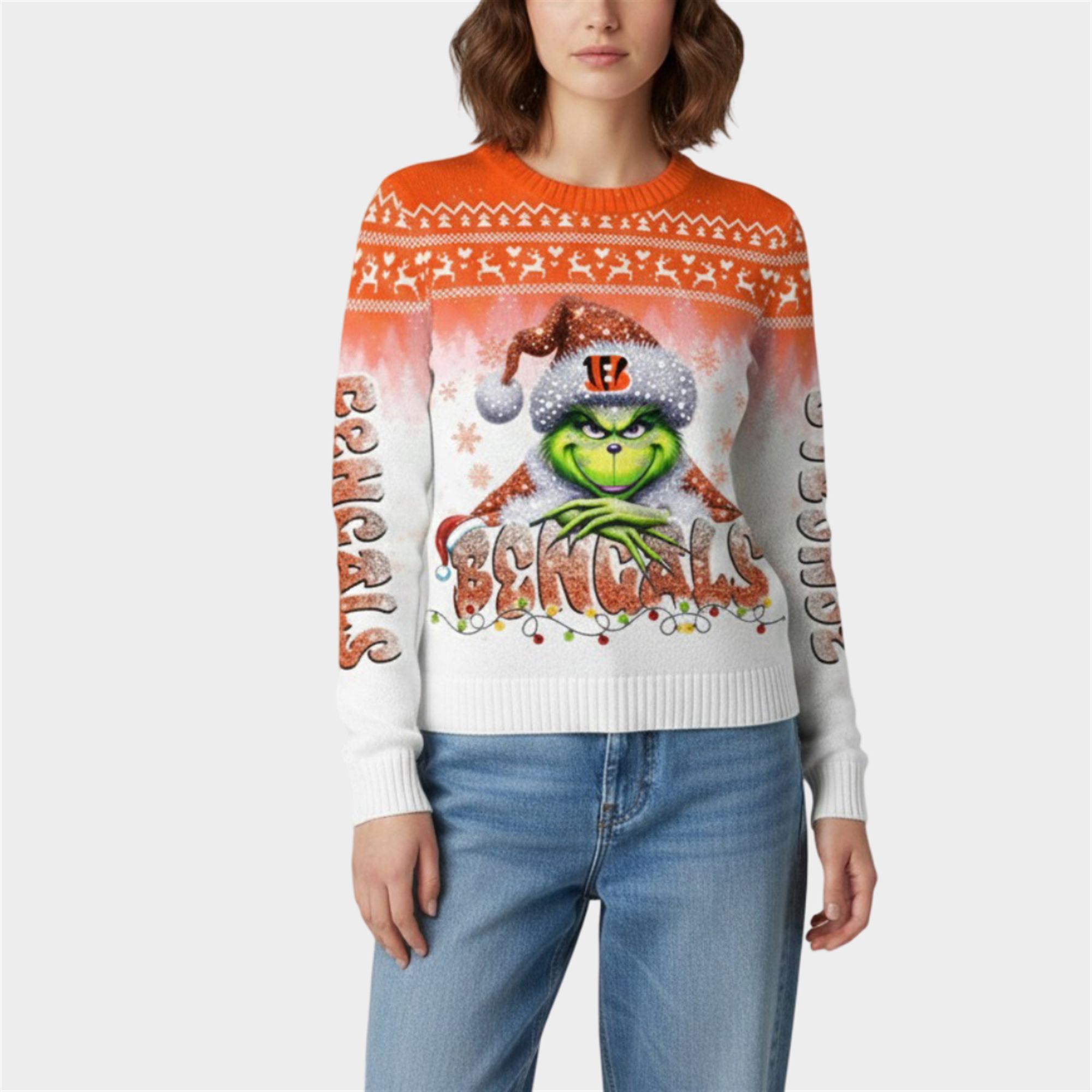 The 2025 Cincinnati Bengals Sweater is a vibrant celebration of football culture and Christmas humor. The design features a striking white-to-orange gradient background that immediately catches the eye. Center stage is the Grnch himself, looking mischievously delightful while wearing a plush Santa hat emblazoned with the classic Bengals “B” logo.