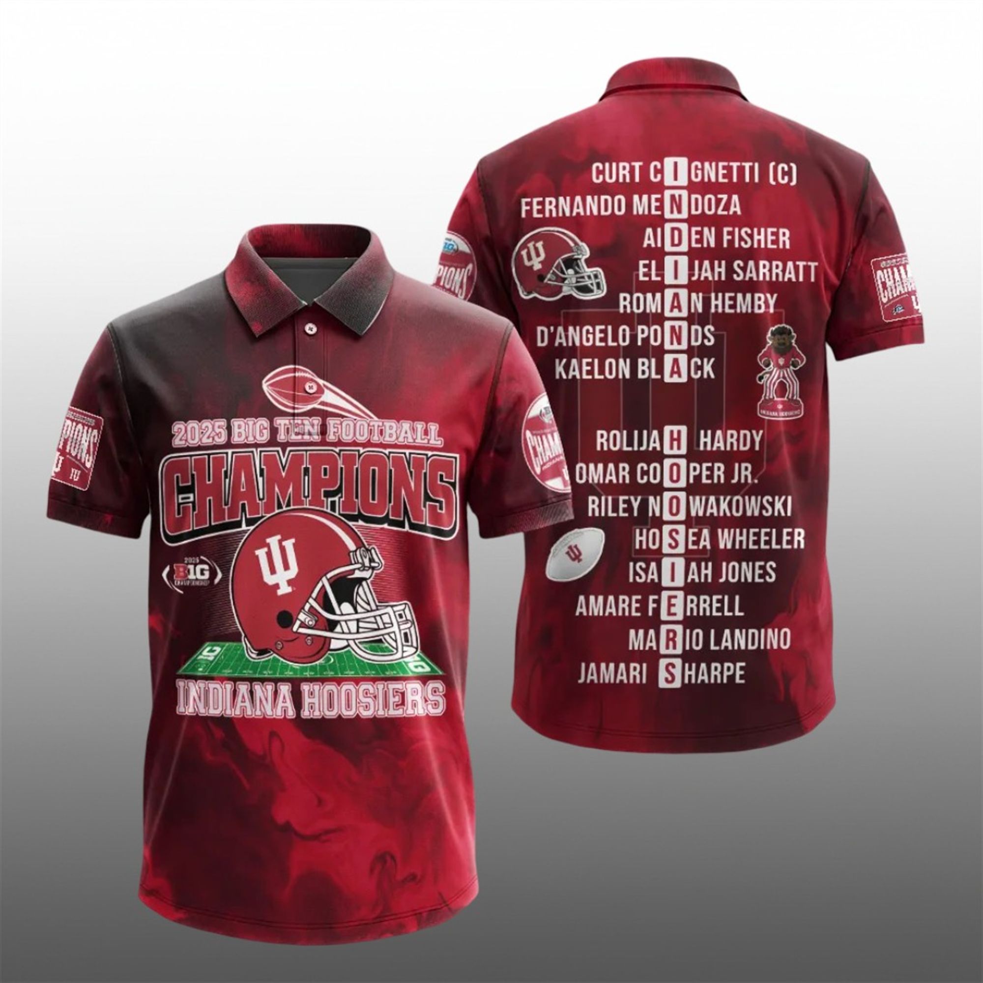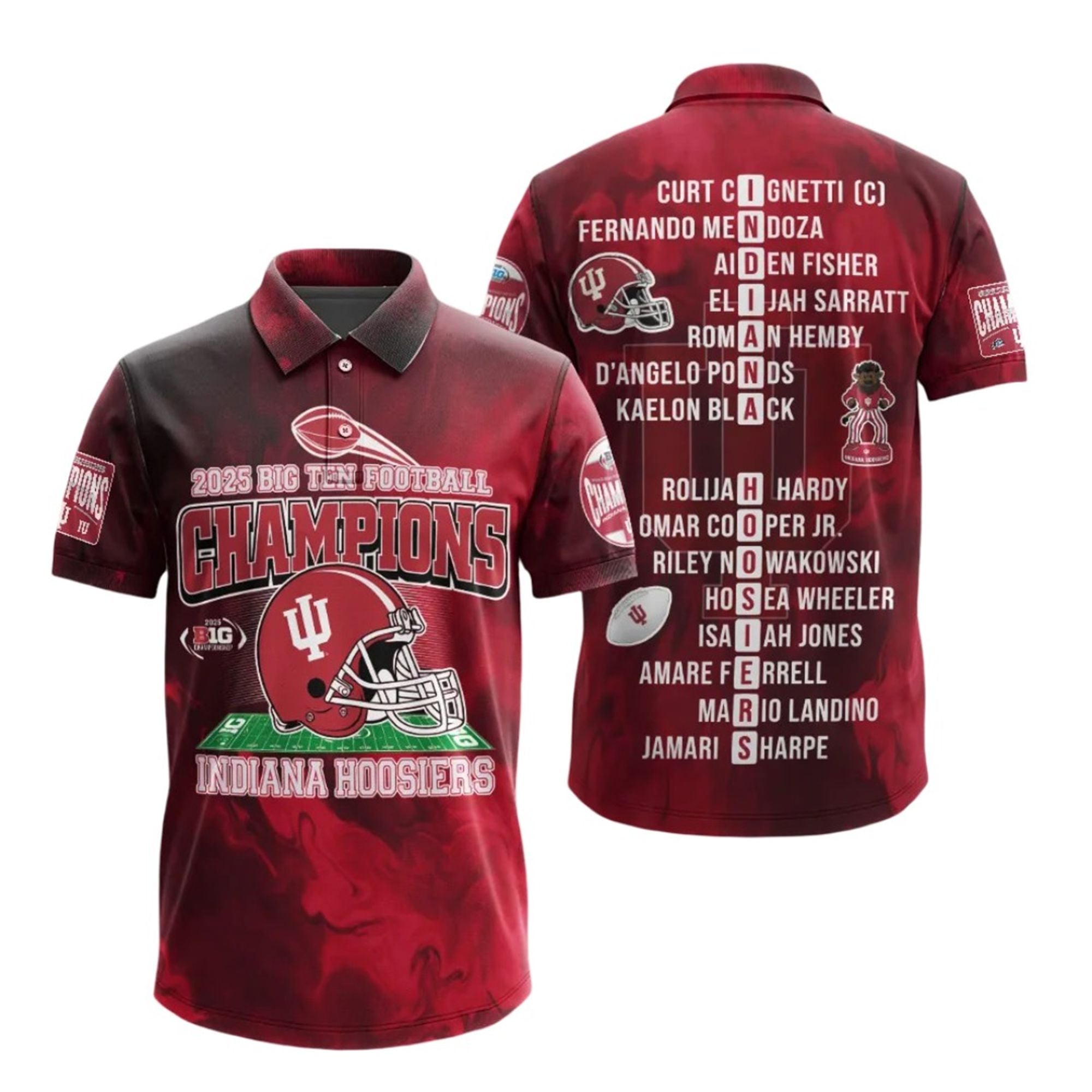 Unlike standard fan gear, this polo offers a sophisticated “all-over print” design using sublimation technology. The deep crimson background features a dynamic, smoky texture that gives the shirt a modern, aggressive look, perfectly matching the intensity the Hoosiers brought to the field. The front proudly displays the 2025 Big Ten Football Champions title alongside the iconic IU helmet and football graphics, ensuring there is no question about who runs the conference.