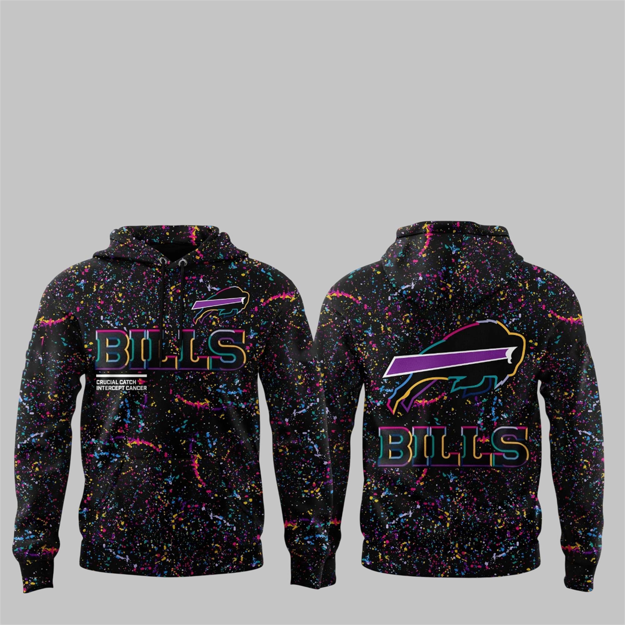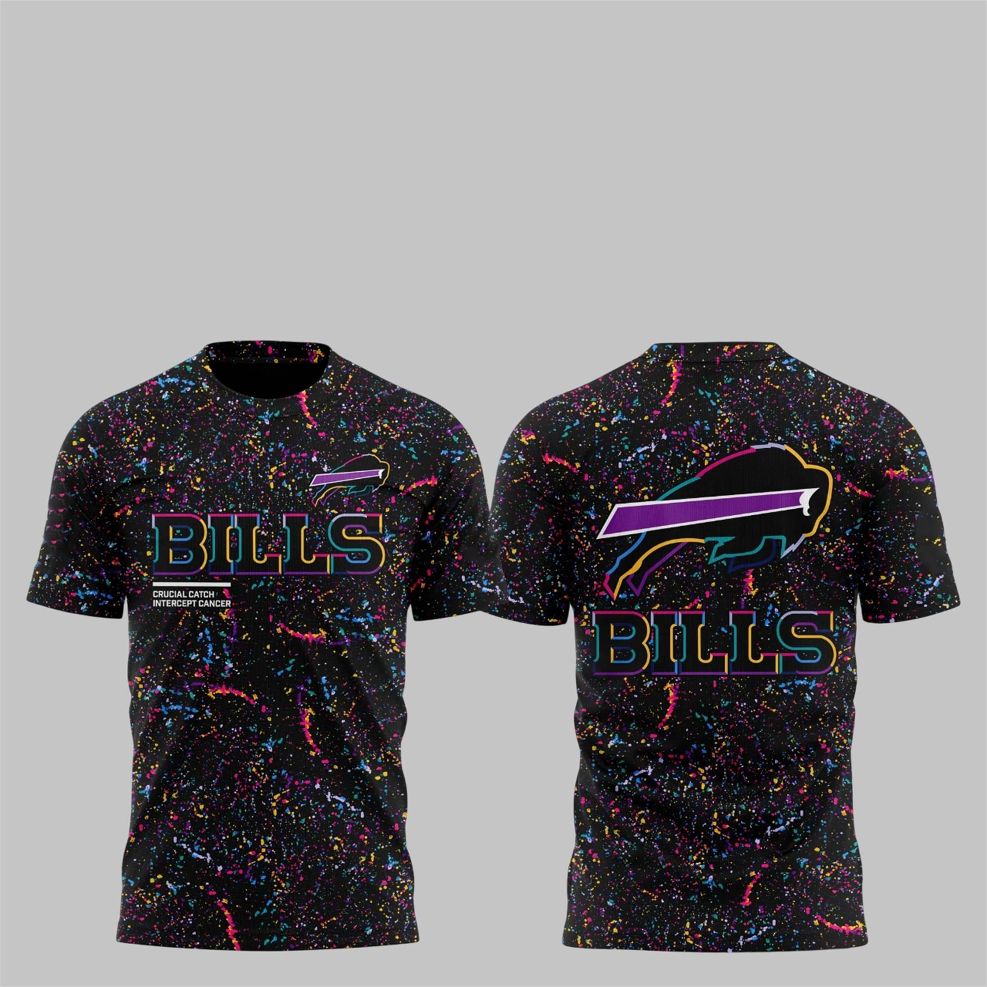 The front of the shirt showcases the “BILLS” wordmark in a clean, multi-colored outline, with the official “Crucial Catch: Intercept Cancer” slogan subtly placed below. The back is dominated by an oversized, reimagined charging buffalo logo, filled with the same eye-catching multi-color gradient, sitting proudly above another “BILLS” wordmark. This dual-sided design ensures your team pride is visible from every angle, making it the standout piece in any fan’s collection.