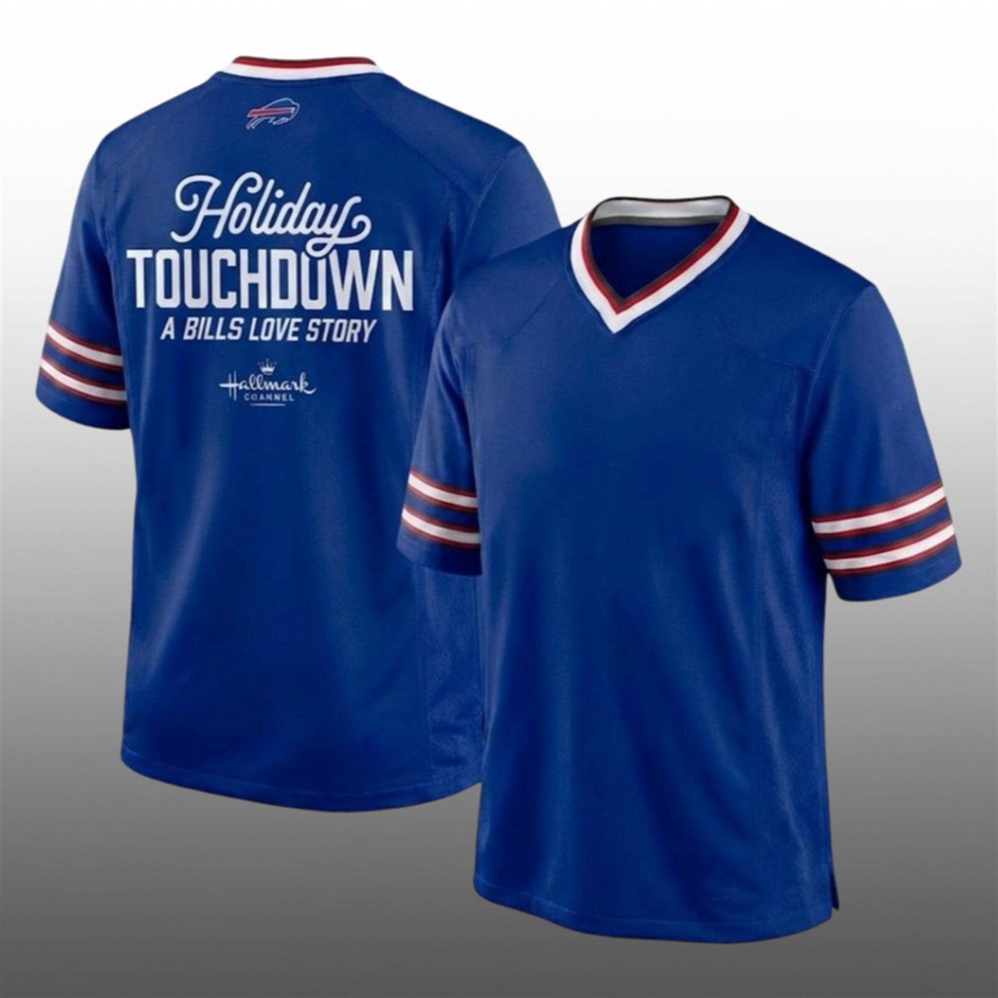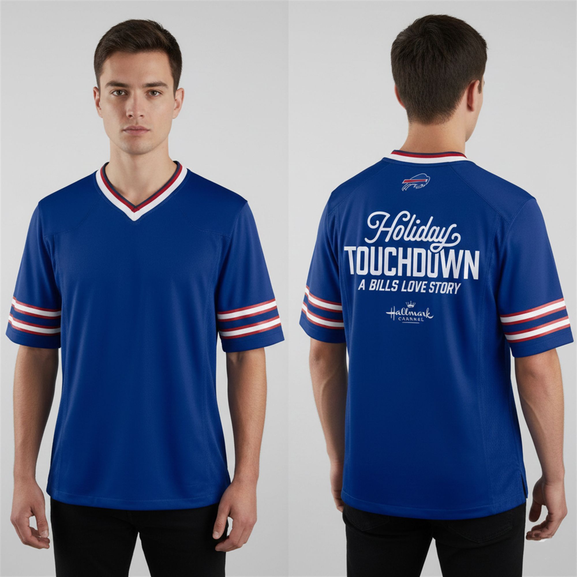 Designed in the classic Buffalo royal blue, this fashion jersey features a stylish V-neck collar and sleeves accented with the team’s signature red and white striping. The back of the jersey displays the heartwarming “Holiday Touchdown: A Bills Love Story” typography, complete with the Hallmark Channel and the iconic charging buffalo emblem on the neck. It’s the perfect conversation starter for ugly sweater parties, holiday gatherings, or game day.