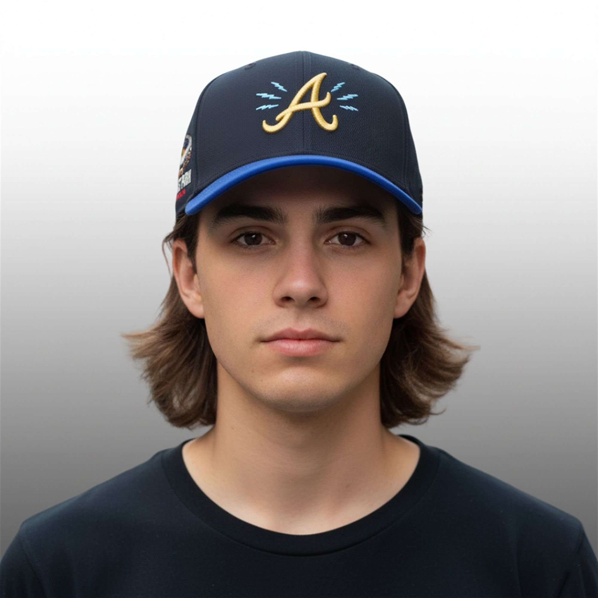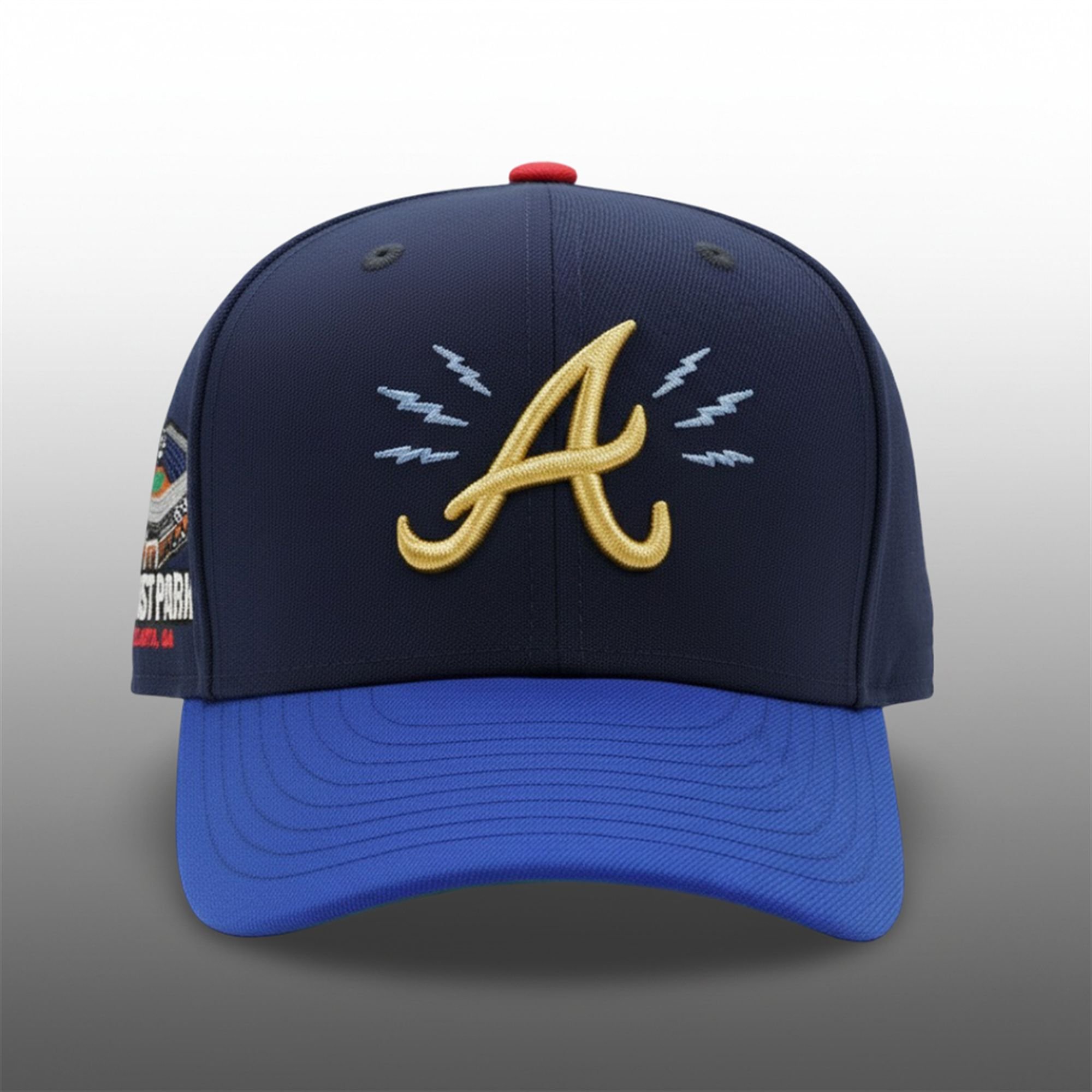 The centerpiece is the iconic Braves “A” logo, reimagined in a brilliant, multi-density “Golden Metallic” thread. This isn’t just a logo; it’s a bolt of energy. Surrounding the “A” are stylized “Bolts and Thunder” lightning graphics, stitched with precision to signify the power and electric excitement of the team. Complemented by a contrasting royal blue visor and a classic red top button, this cap’s color palette is a bold new take on traditional Braves colors.