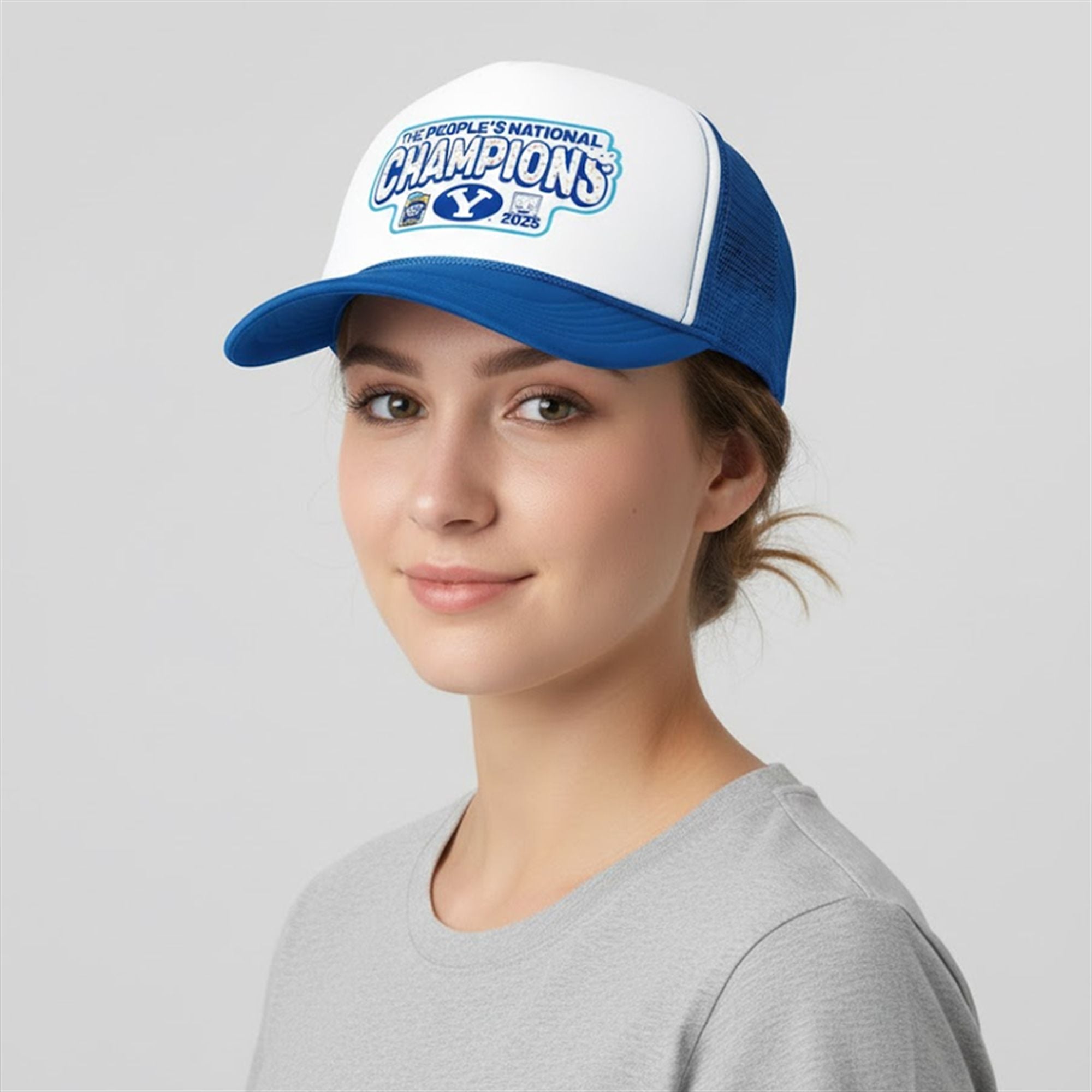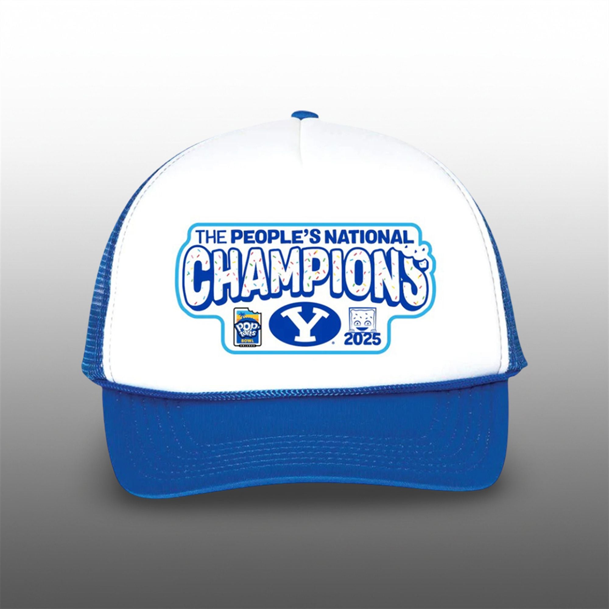 The centerpiece of the design is the vibrant, puff-print graphic that reads “THE PEOPLE’S NATIONAL CHAMPIONS” in bold, collegiate lettering. The word “CHAMPIONS” is stylized with blue frosting and colorful sprinkles, paying homage to the viral Pop-Tarts branding that defined the bowl game. Flanked by the Pop-Tarts Bowl logo and a cheeky graphic of the “Edible Mascot“, this hat perfectly encapsulates the fun and absurdity of the event. The BYU “Y” logo anchors the design in the center, ensuring there is no mistake about who claimed the trophy—and the first bite.