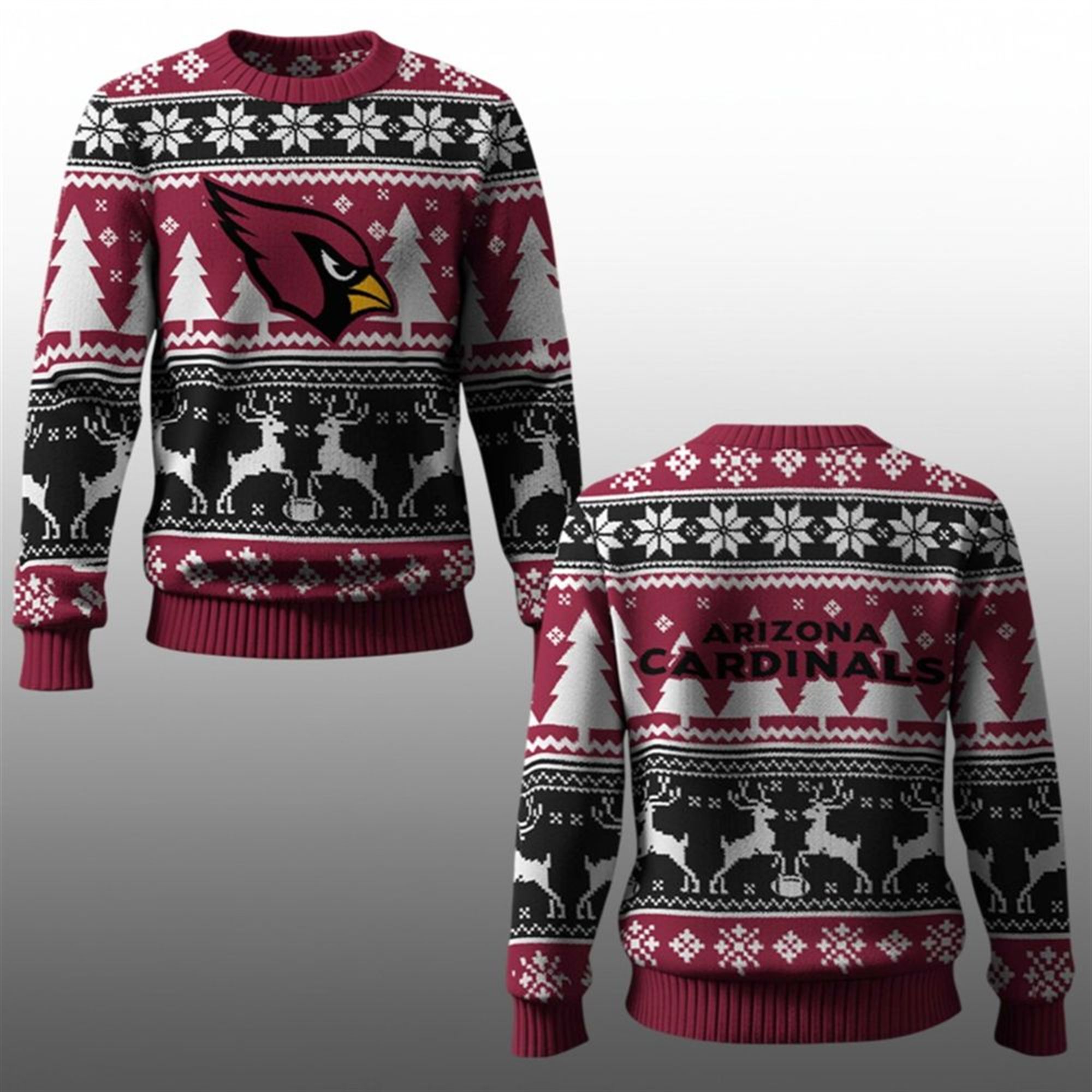 The pattern is meticulously detailed. Below the team logo, a playful row of white reindeer stand nose-to-nose, framing a football—a subtle nod to the winter matches that define the season. The backdrop is a rich, deep Cardinal Red, accented with black and white geometric bands, snowflakes, and evergreens. The back of the sweater continues the festive chaos, featuring the text “ARIZONA CARDINALS” in bold block letters across the shoulders, ensuring your fandom is visible from every angle.