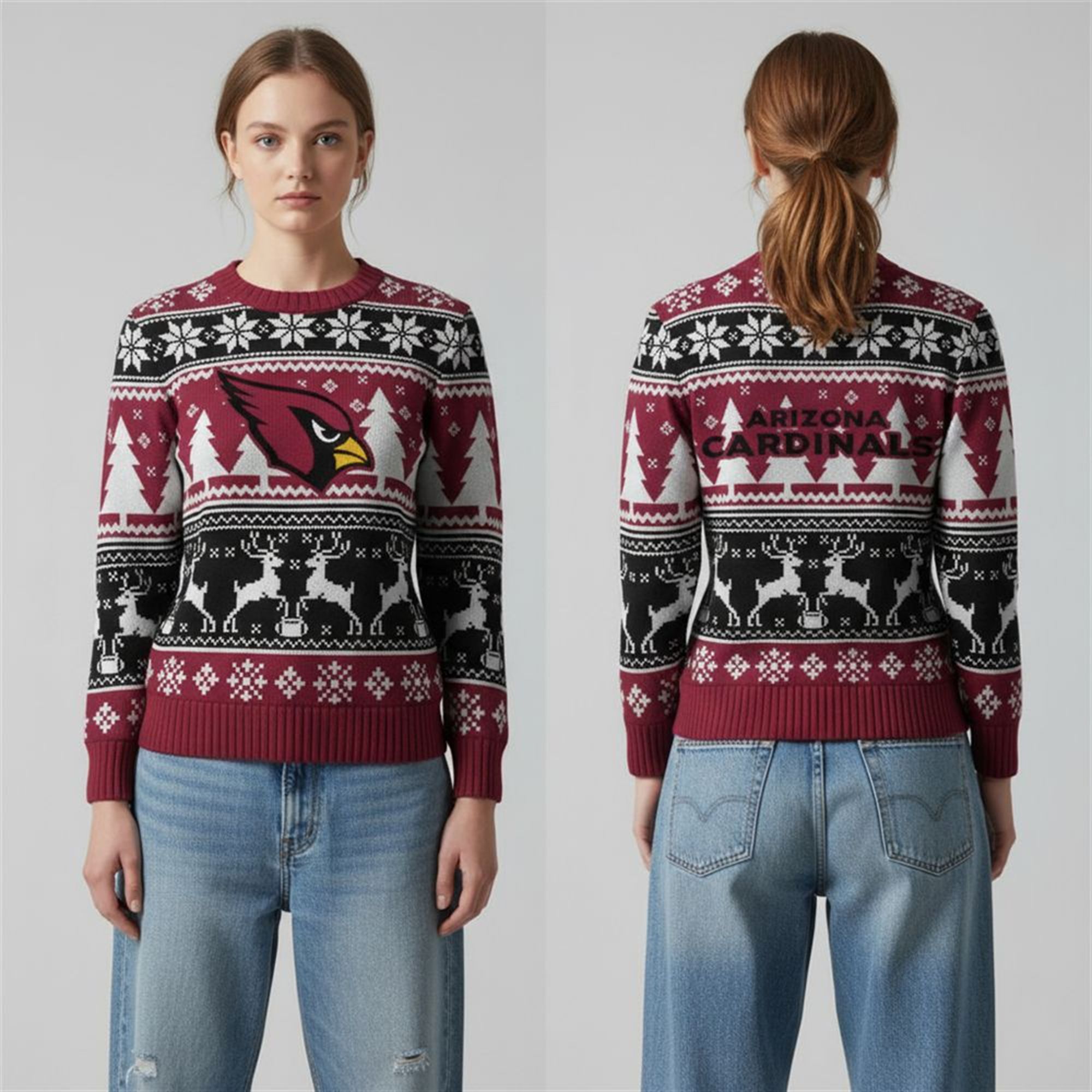 The 2025 Arizona Cardinals Ugly Sweater is a masterclass in festive fan apparel. This sweater is visually anchored by the iconic Cardinals logo proudly displayed on the upper chest, instantly identifying your allegiance.