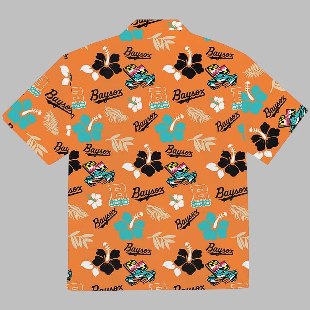 Make a bold statement with this shirt’s eye-catching design, set against a vibrant orange backdrop that reflects the team’s energetic spirit. The custom pattern is a visual celebration of the Chesapeake Baysox, featuring a dynamic mix of iconic elements. You’ll find the classic “Baysox” script logo and the bold “B” emblem intricately woven throughout the design. These are perfectly complemented by tropical flora, including stylish black and turquoise hibiscus flowers and breezy tan palm fronds. Adding a playful touch, the team’s beloved mascot is depicted cruising in a retro car, infusing the shirt with personality and charm. This isn’t just a shirt; it’s a wearable piece of art that tells the story of Baysox baseball and summer fun.