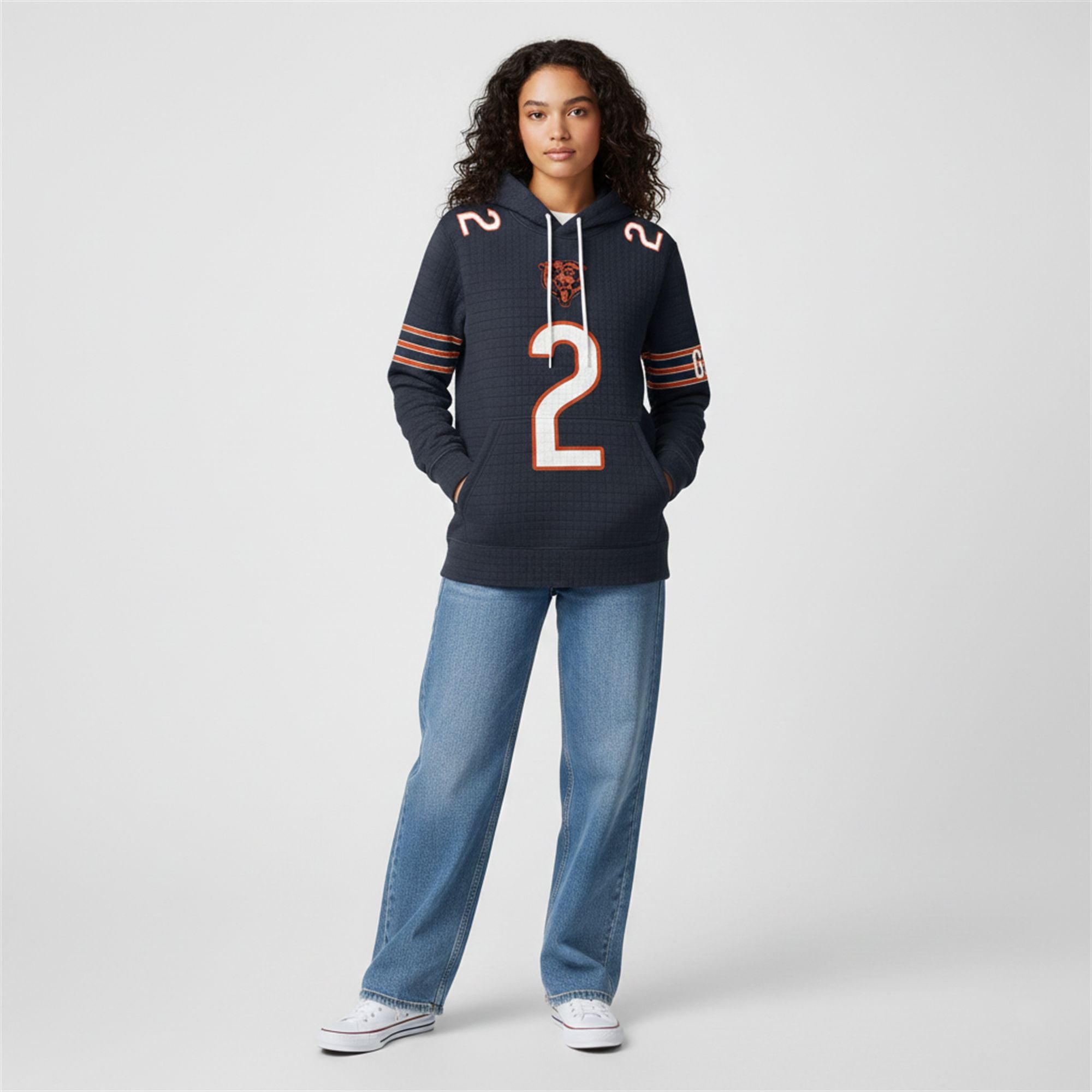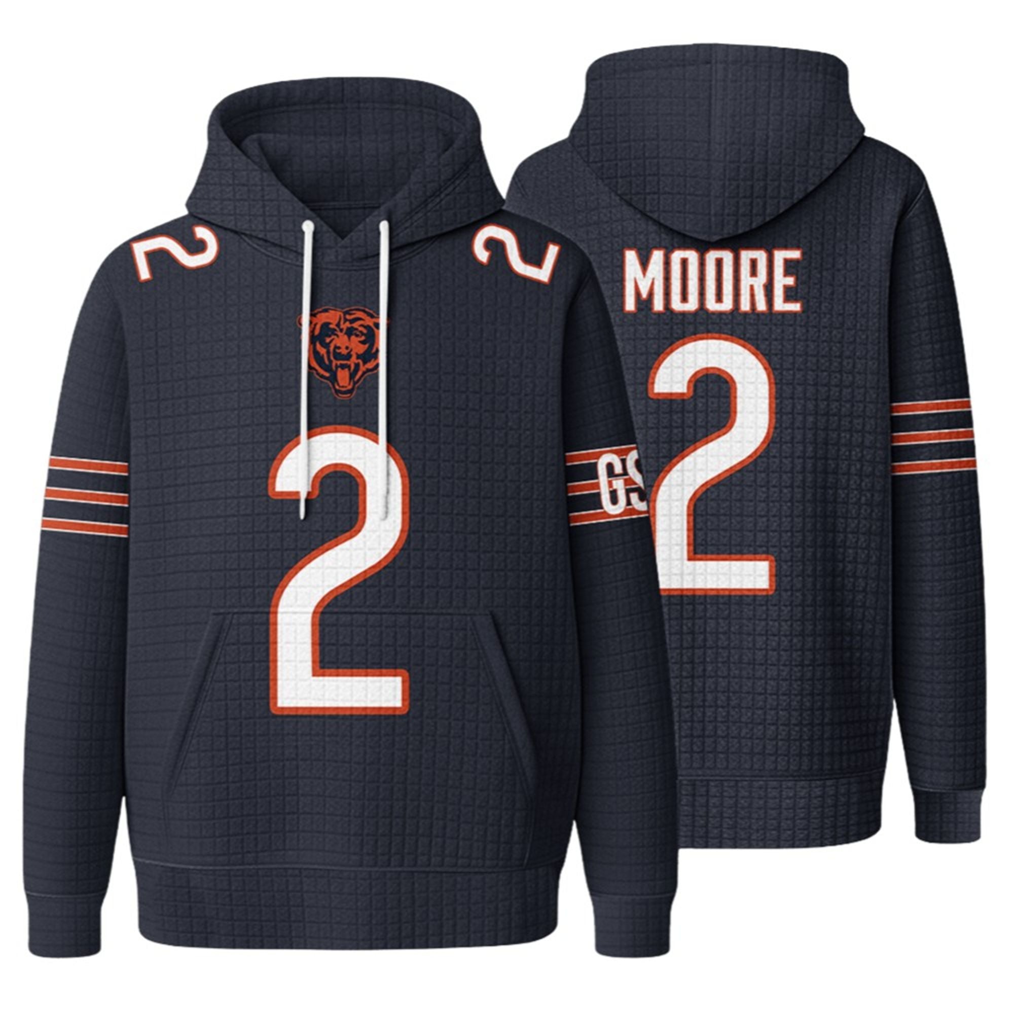 Visually, the hoodie is a stunner. Drenched in deep Chicago Navy, it features a massive, crisp white #2 on the chest and back, outlined in vibrant Bears orange. The legendary Bears head logo sits proudly at the neckline, replacing standard generic branding. Additional details like the “MOORE” nameplate on the back and striped sleeve accents give this piece the authentic look of a player jersey with the cozy feel of your favorite blanket.