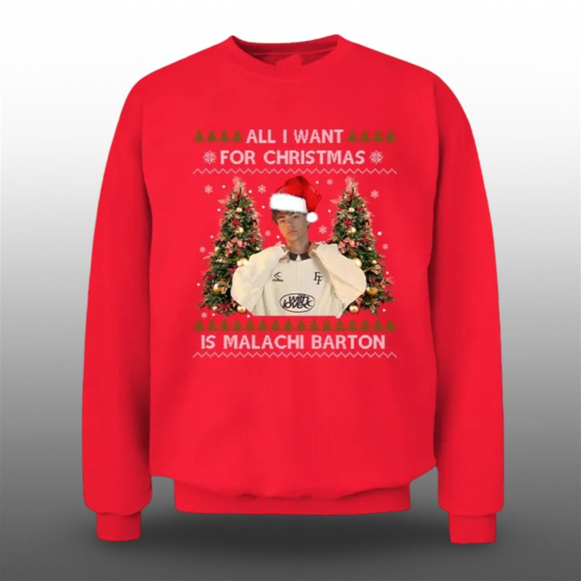 This vibrant red sweatshirt captures the essence of a traditional “ugly” Christmas sweater but modernizes it with a high-quality digital print. The design features a centered image of actor Malachi Barton looking effortlessly cool in a Santa hat and his own stylish knitwear, flanked by decorated Christmas trees and festive snowflakes. The bold text, “ALL I WANT FOR CHRISTMAS IS MALACHI BARTON,” playfully riffs on the world’s most famous holiday anthem, making it an instant hit for the 2025 season.