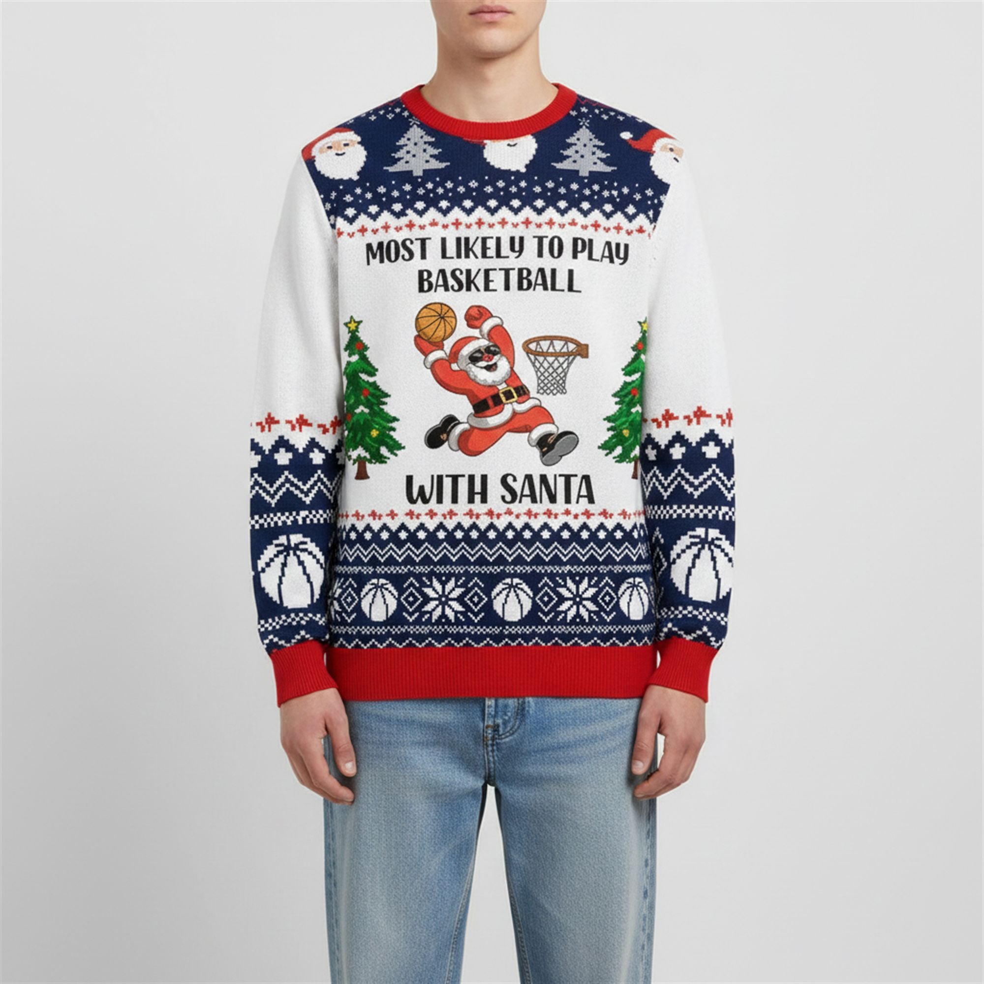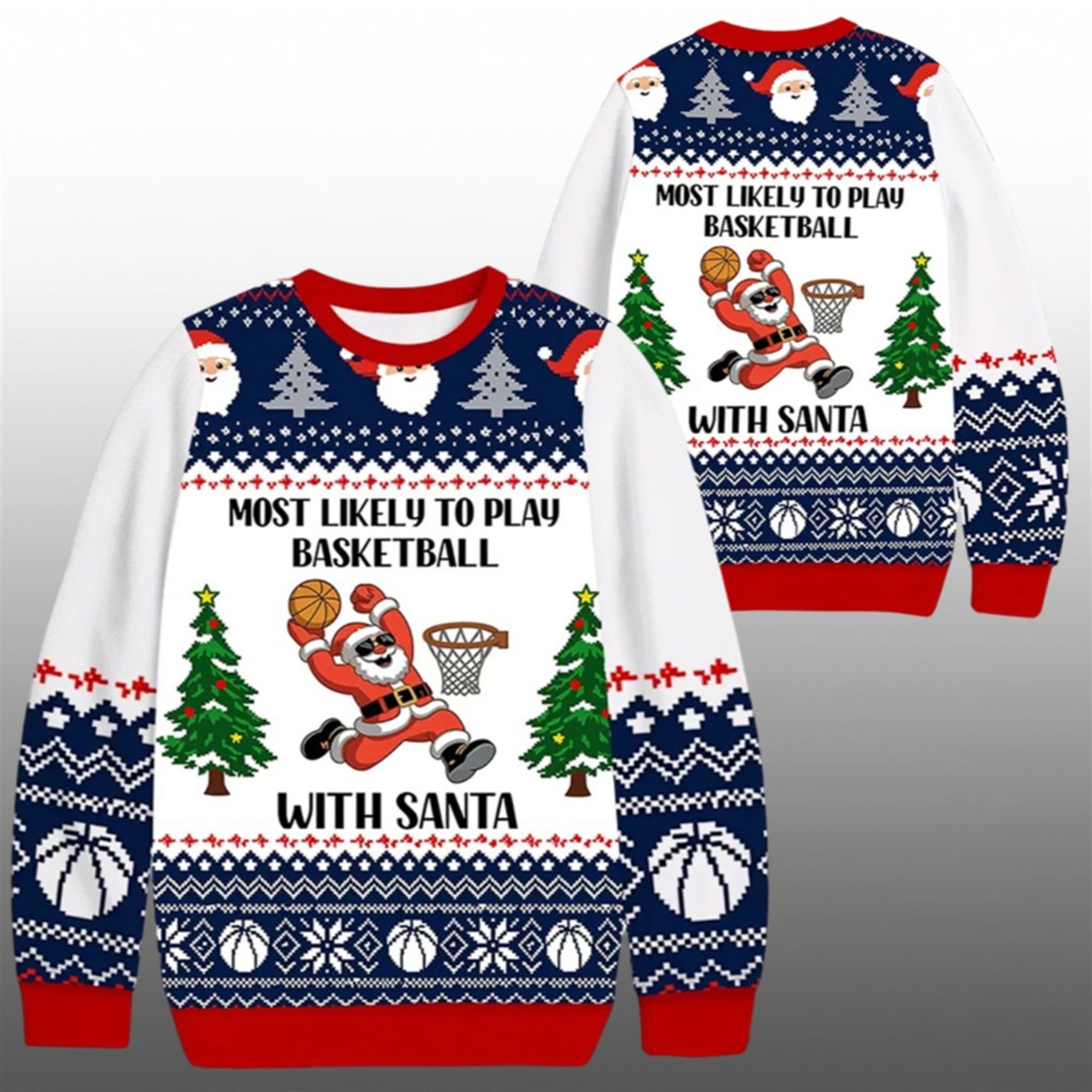 Gone are the days of boring holiday attire. This sweatshirt showcases a confident, sunglasses-wearing Santa Claus executing a perfect slam dunk, surrounded by a classic “ugly sweater” Fair Isle pattern of snowflakes, pine trees, and basketballs. The bold navy, red, and white color scheme ensures you stand out at every event, from family gatherings to courtside celebrations.