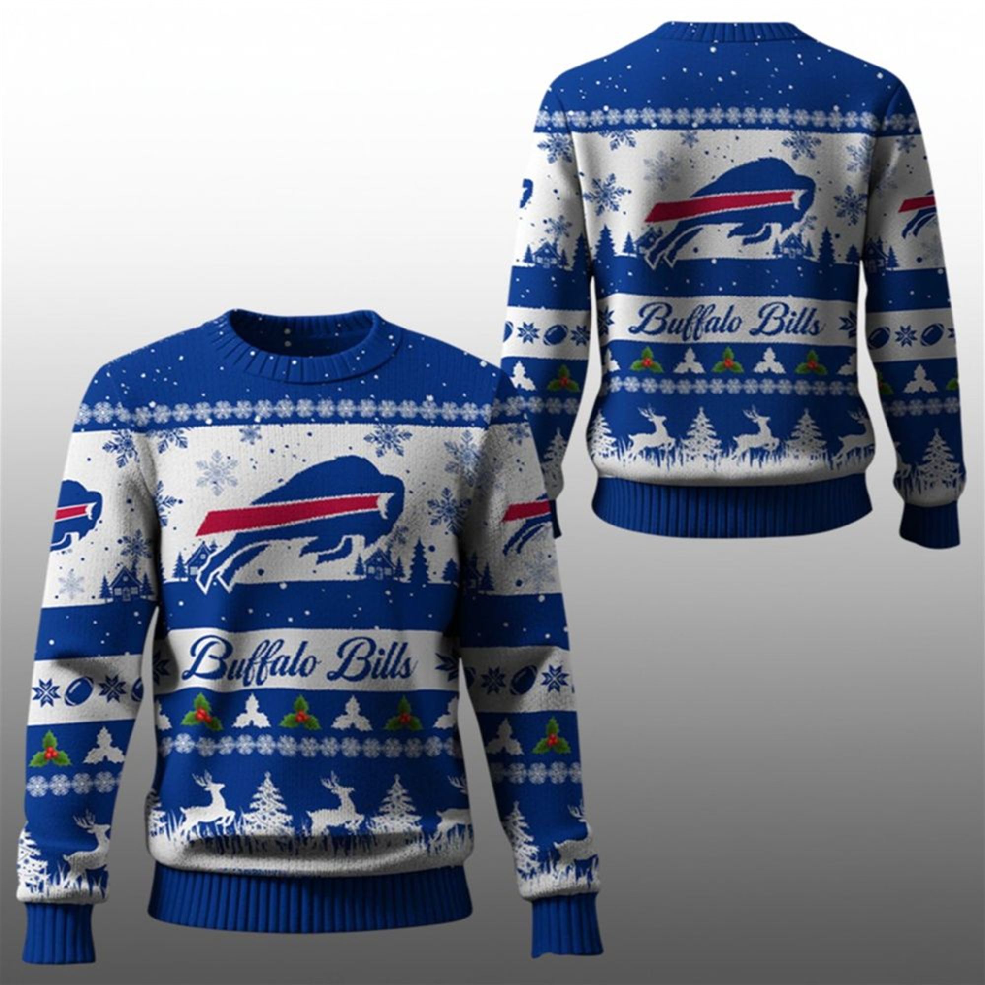 This isn’t just a piece of clothing; it’s a celebration of fandom. The design features a striking “Bills Blue” base, accented with crisp white winter imagery. The centerpiece is the unmistakable charging Buffalo logo, prominently displayed across the chest, flanked by snow-capped pine trees and falling snowflakes. Beneath the logo, the classic “Buffalo Bills” script adds a touch of vintage elegance, while the hem features a whimsical row of reindeer and festive holly, grounding the “ugly sweater” aesthetic with genuine holiday spirit.