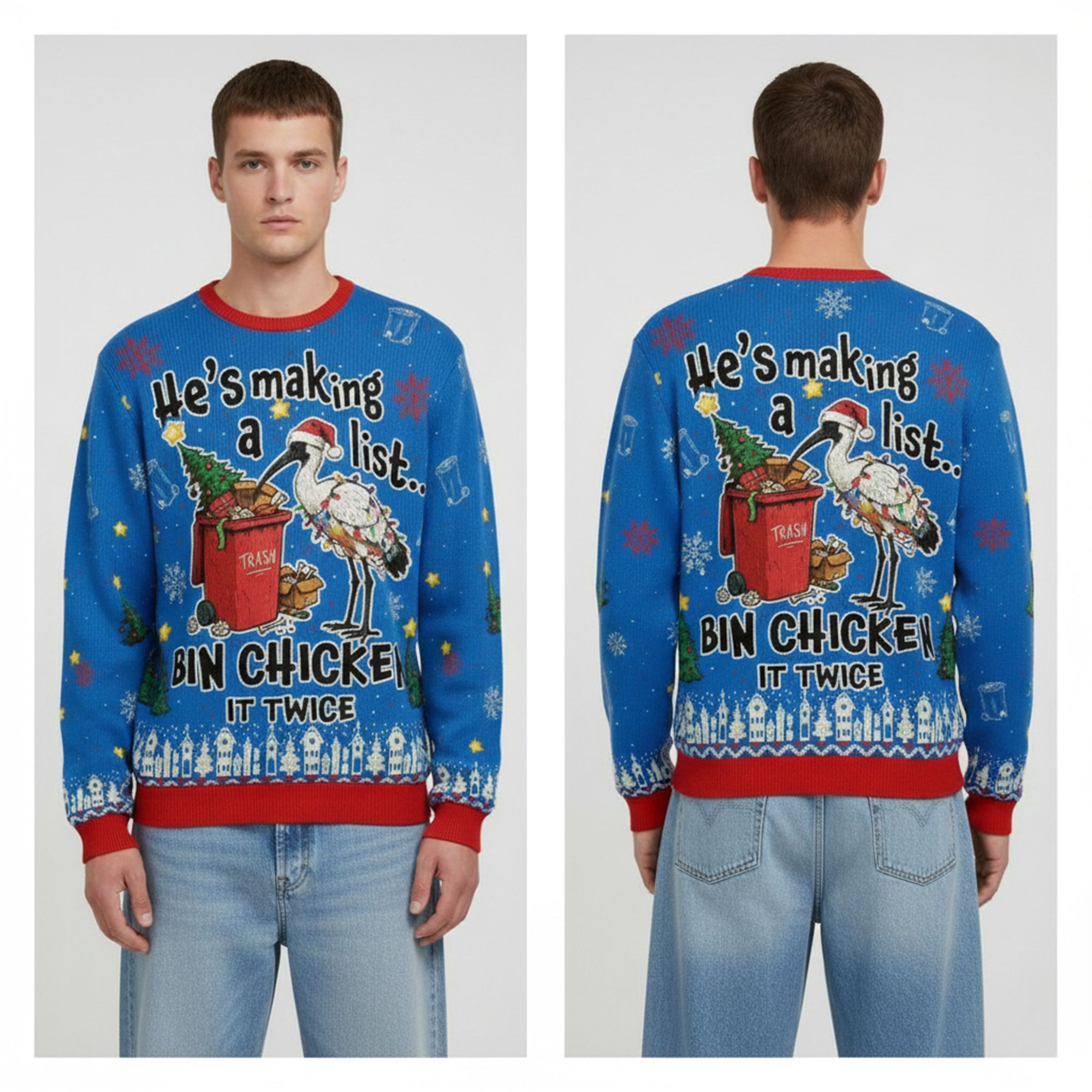 Celebrate Christmas 2025 with a design that speaks to the soul of Australian humor. The Bin Chicken It Twice Ugly Christmas Sweater is not just a piece of clothing; it’s a cultural statement. This vibrant blue pullover showcases a high-quality, knit-style graphic print that mimics the texture of a traditional wool sweater without the itchy discomfort.