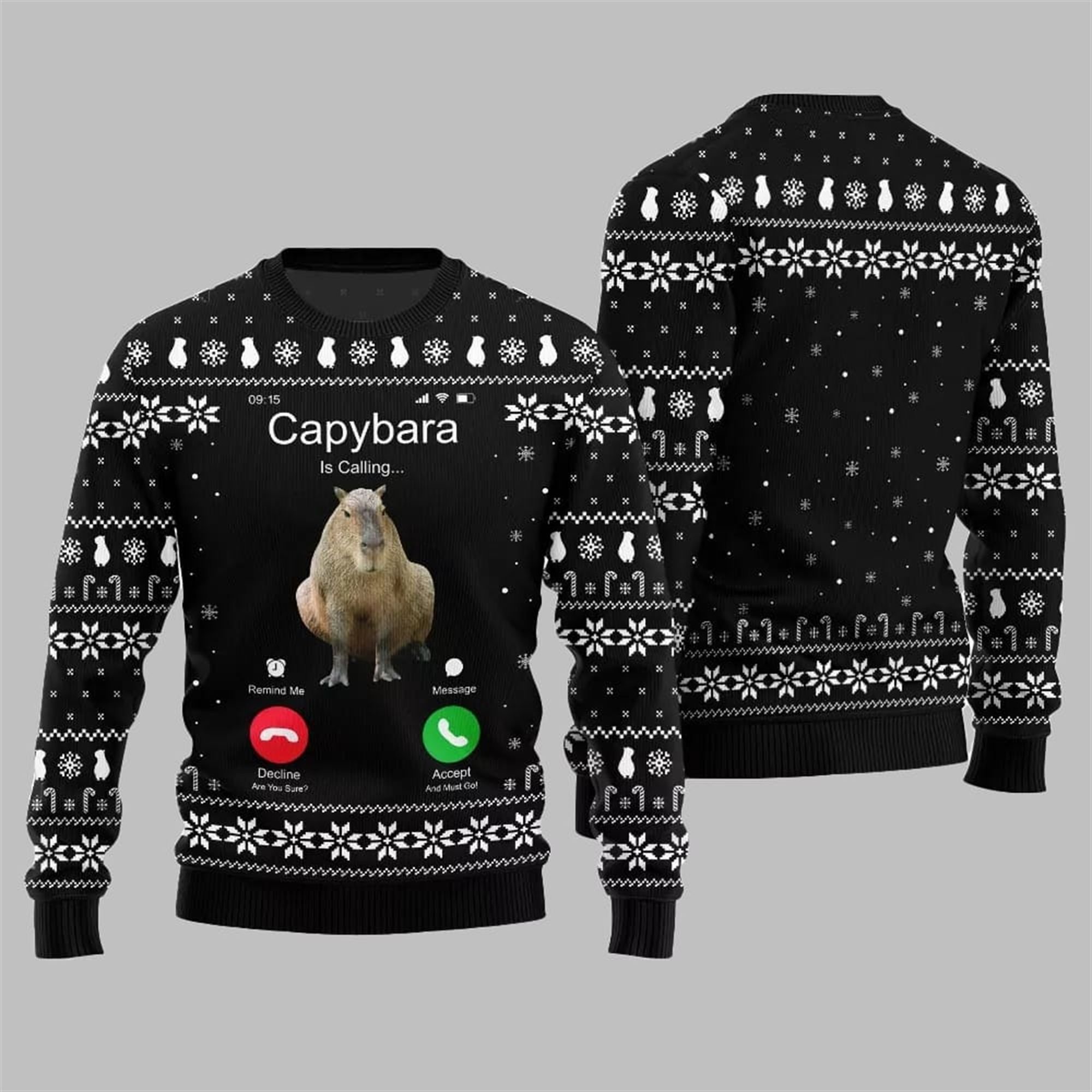 The vibrant green knit is adorned with classic holiday motifs like snowflakes, candy canes, and pixelated patterns, but the star of the show is the brilliantly designed graphic. Front and center, a photorealistic capybara sits calmly within a smartphone interface, under the notification “Capybara Is Calling…” Complete with “Accept” and “Decline” buttons, this sweater is a guaranteed conversation starter that perfectly merges holiday tradition with modern meme-centric fun.