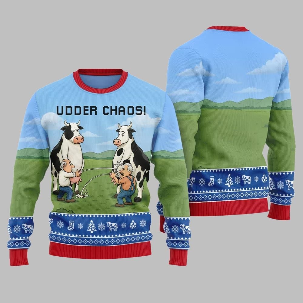 2025 Christmas Cow Udder Chaos Ugly Christmas Sweater | Funny Farm Holiday