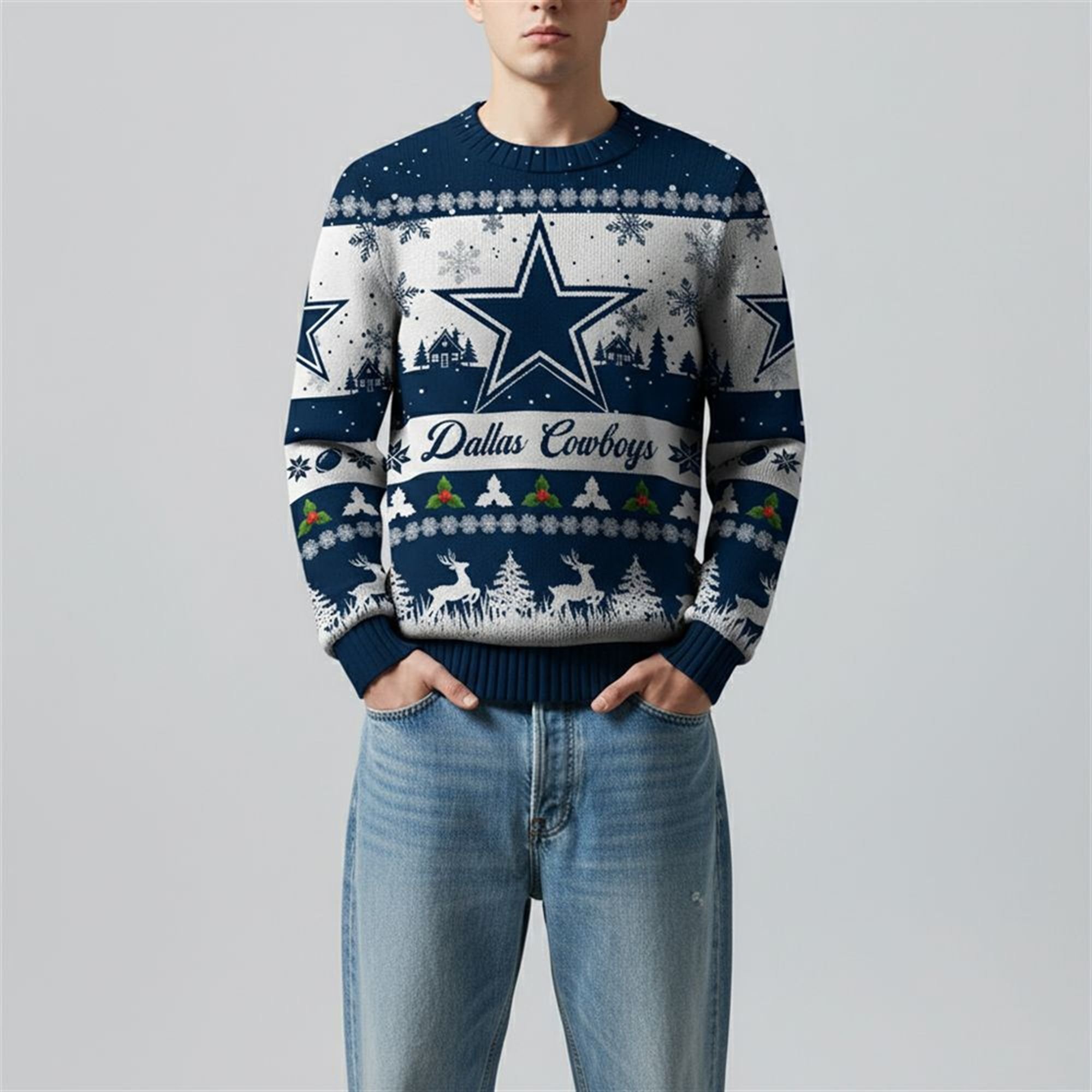 At the center of the chest sits the massive, iconic Dallas Star, instantly recognizable to football fans worldwide. It is framed by a sophisticated “Dallas Cowboys” banner in classic script, ensuring there is no mistake about where your allegiance lies. But this isn’t just a sports jersey; it is a holiday staple. The design is intricately layered with rows of winter elements, including majestic reindeer, snow-dusted pine trees, falling snowflakes, and festive holly berries. Look closely, and you’ll even spot subtle footballs integrated into the geometric borders, bridging the gap between the North Pole and the End Zone.