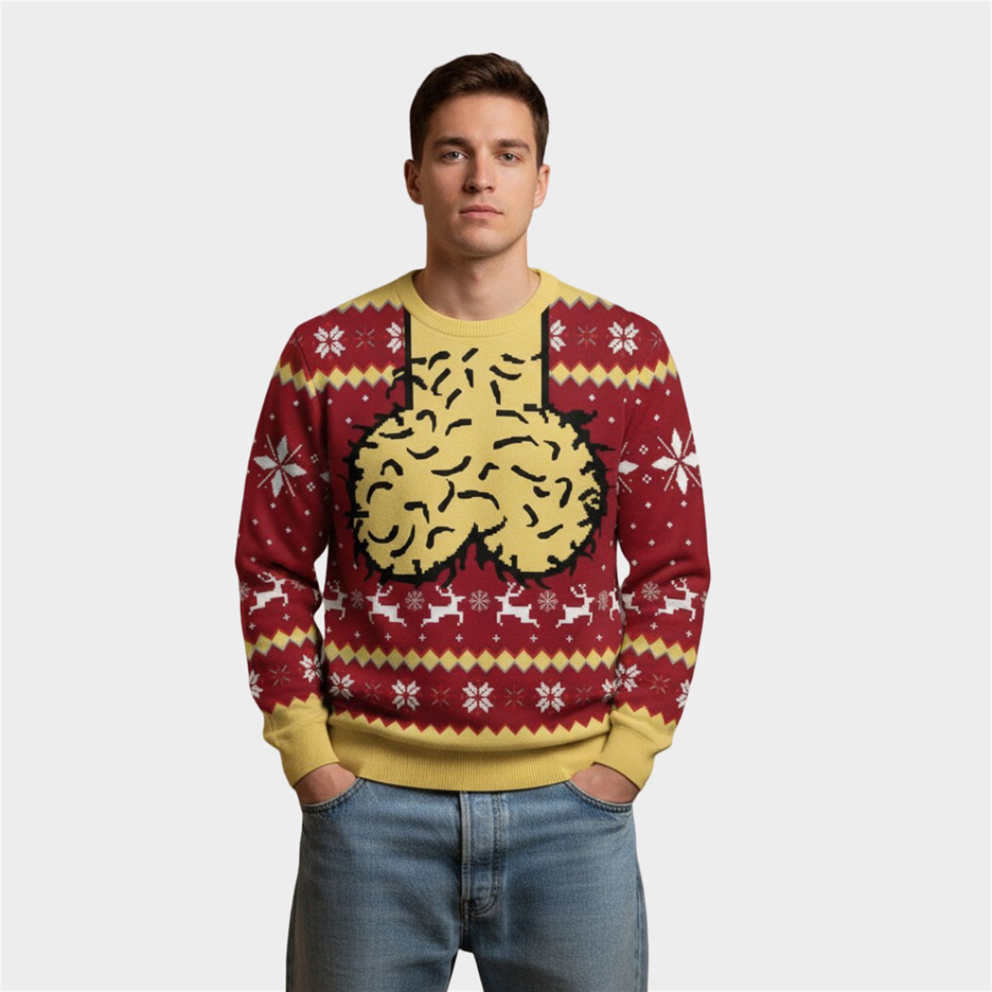 However, the centerpiece tells a different story. Dominating the chest is a large, pixelated, faux-knit graphic of the “lower male anatomy.” The design is strategically placed so that the anatomy rises toward the neckline. The punchline? When you put it on, your head completes the anatomy, effectively turning you into a literal “Dickhead.” It is a seamless blend of high-quality apparel manufacturing and low-brow humor that perfectly captures the chaotic energy of modern holiday partying.