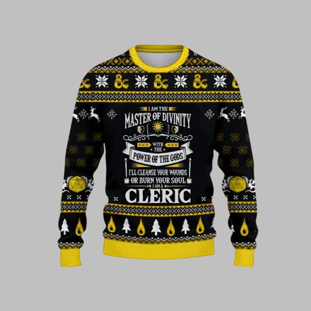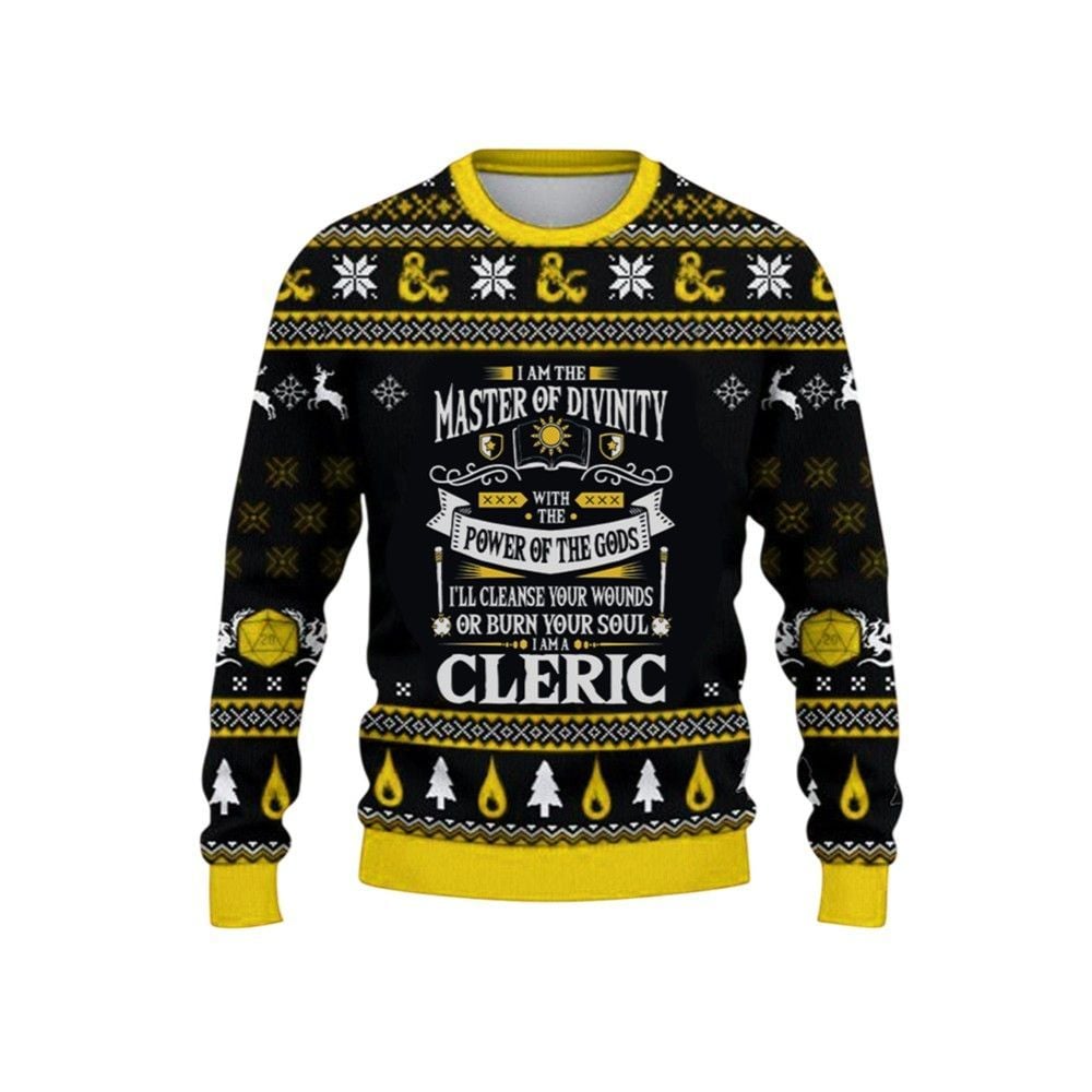 The intricate design is a tribute to the Cleric, featuring bold text that reads, “I AM THE MASTER OF DIVINITY,” “WITH THE POWER OF THE GODS,” and the classic Cleric ultimatum: “I’LL CLEANSE YOUR WOUNDS OR BURN YOUR SOUL.” Set against a backdrop of traditional Nordic patterns, snowflakes, and festive reindeer, you’ll also find iconic d20s on the sleeves and a central Cleric emblem, ensuring your geek credentials are on full display. The striking black and yellow color scheme is both eye-catching and stylish, making it the perfect centerpiece for any holiday outfit.