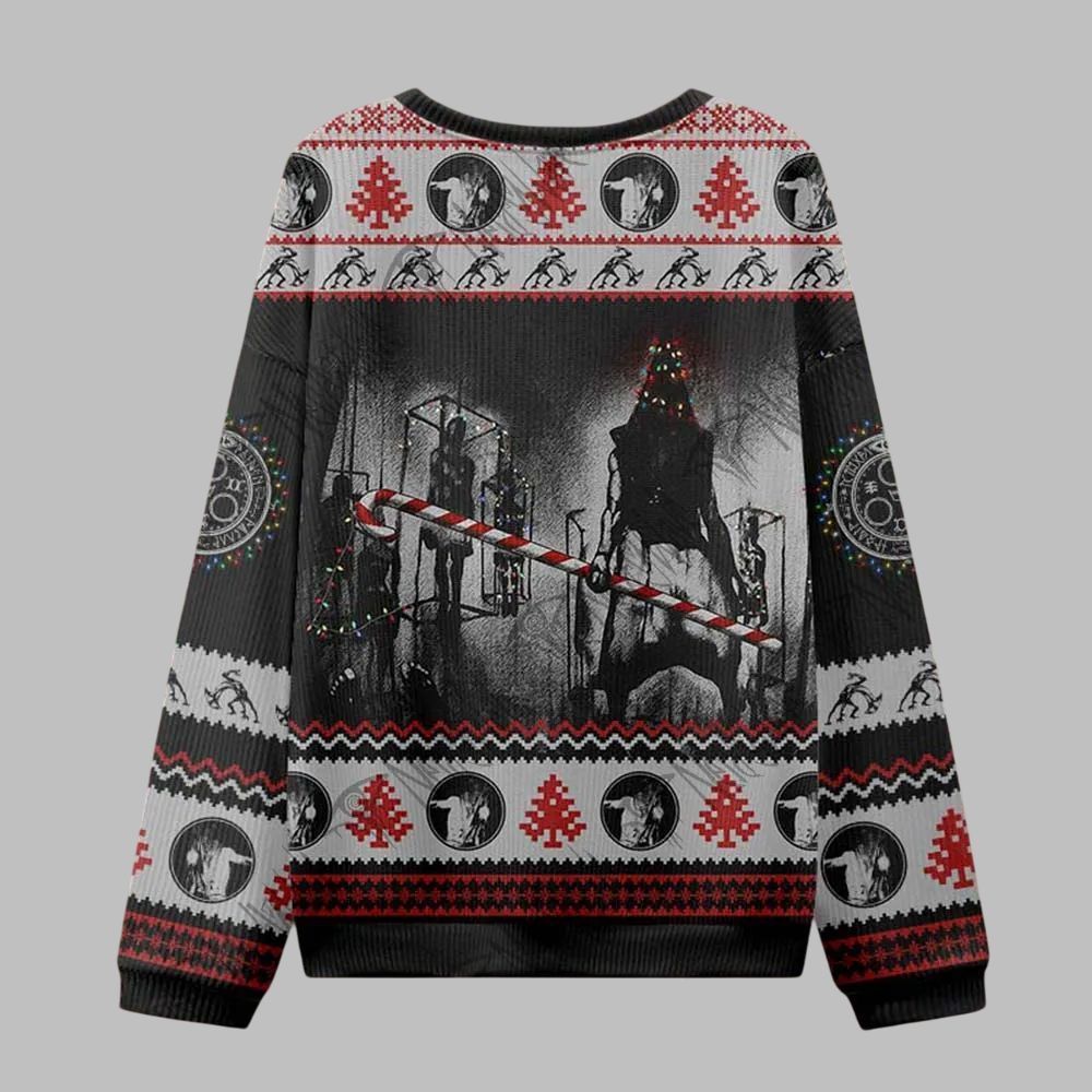 This sweater’s design is a chilling homage to the tense world of survival horror. The centerpiece is a haunting winter landscape shrouded in an ominous fog, featuring iconic imagery like menacing hooks and generators adorned with deceptively festive Christmas lights. A towering, shadowy figure dominates the scene, creating a sense of thrilling suspense. The bold text, “DON’T GET LOST IN THE FOG THIS CHRISTMAS,” serves as both a warning and an invitation to an alternative holiday experience. The design is flawlessly integrated with classic ugly sweater patterns, including rows of red Christmas trees and eerie, mask-like icons, creating a perfect fusion of festive tradition and gamer culture.