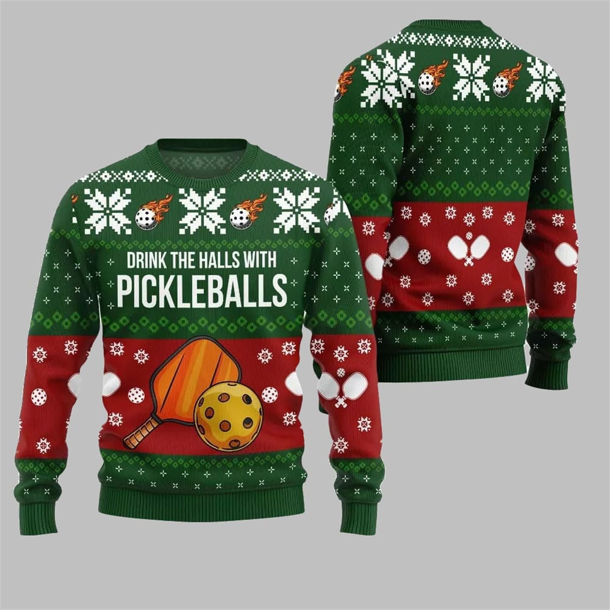 This sweater is meticulously designed for the pickleball community. The vibrant, multi-layered design features classic Christmas elements like intricate snowflakes and festive patterns, seamlessly blended with the icons of your favorite sport. Across the chest, a bold red stripe showcases crossed pickleball paddles and a wiffle ball, set against a backdrop of smaller paddle motifs. The standout feature is the clever and humorous phrase, “DRINK THE HALLS WITH PICKLEBALLS,” a playful pun that’s guaranteed to be a conversation starter at any holiday party, family dinner, or pickleball club event. The design is completed with unique shoulder details featuring flaming pickleballs, adding a touch of fiery fun to the traditional Nordic sweater pattern.