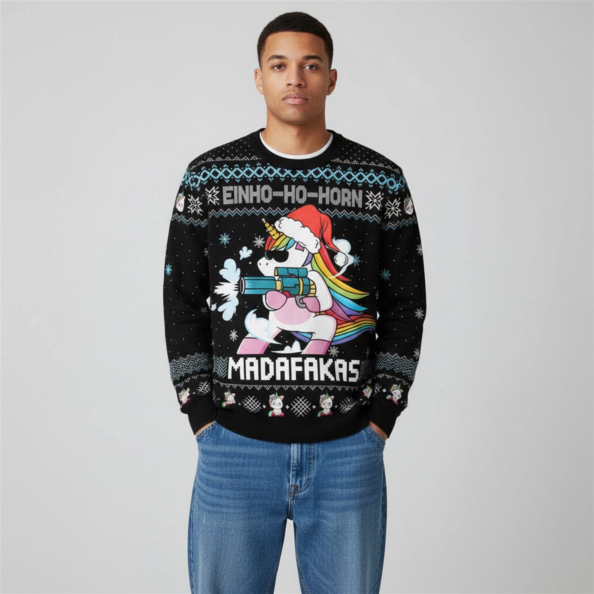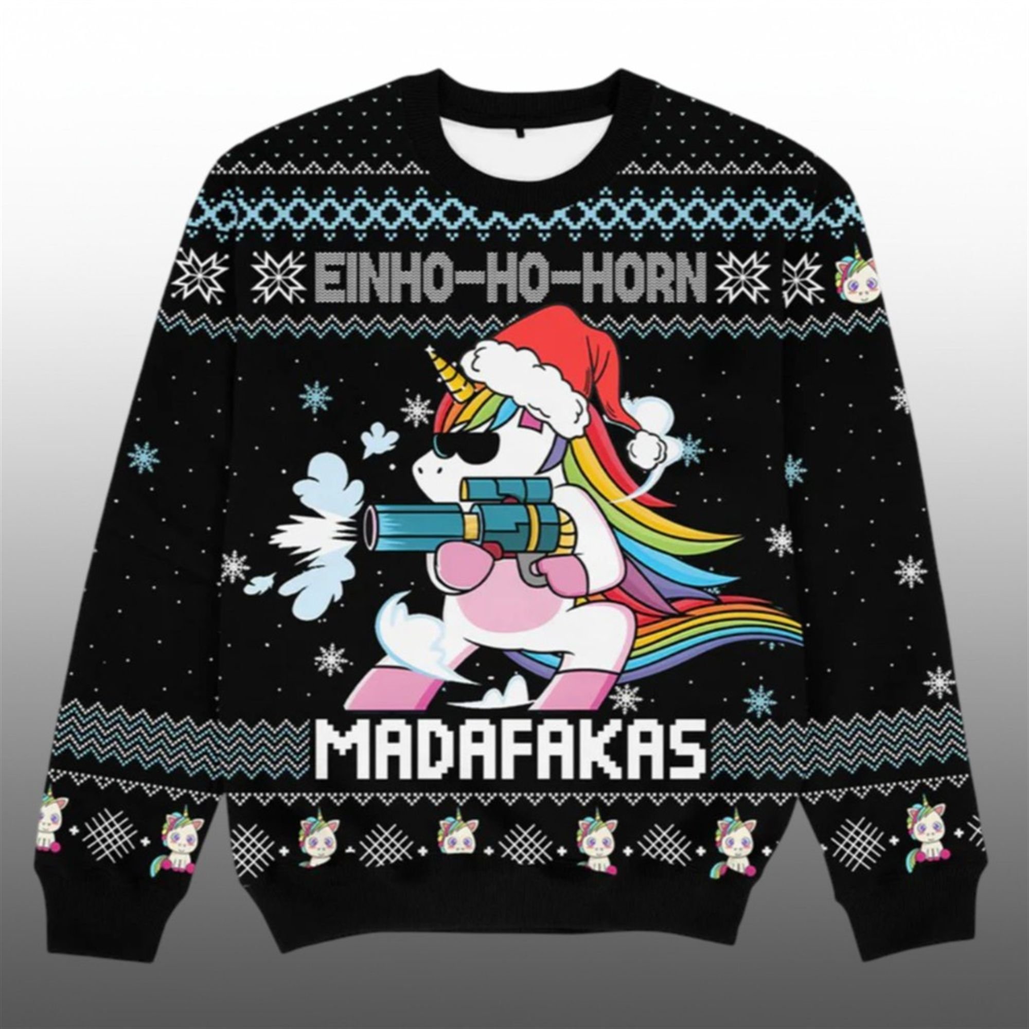Surrounded by a faux-knit pattern of snowflakes and geometric shapes, the design balances classic festive nostalgia with modern internet humor. The slogan “EINHO-HO-HORN” (a clever play on Einhorn, the German word for Unicorn) sits boldly at the top, while the bottom text “MADAFAKAS” ensures that nobody mistakes your holiday spirit for weakness.