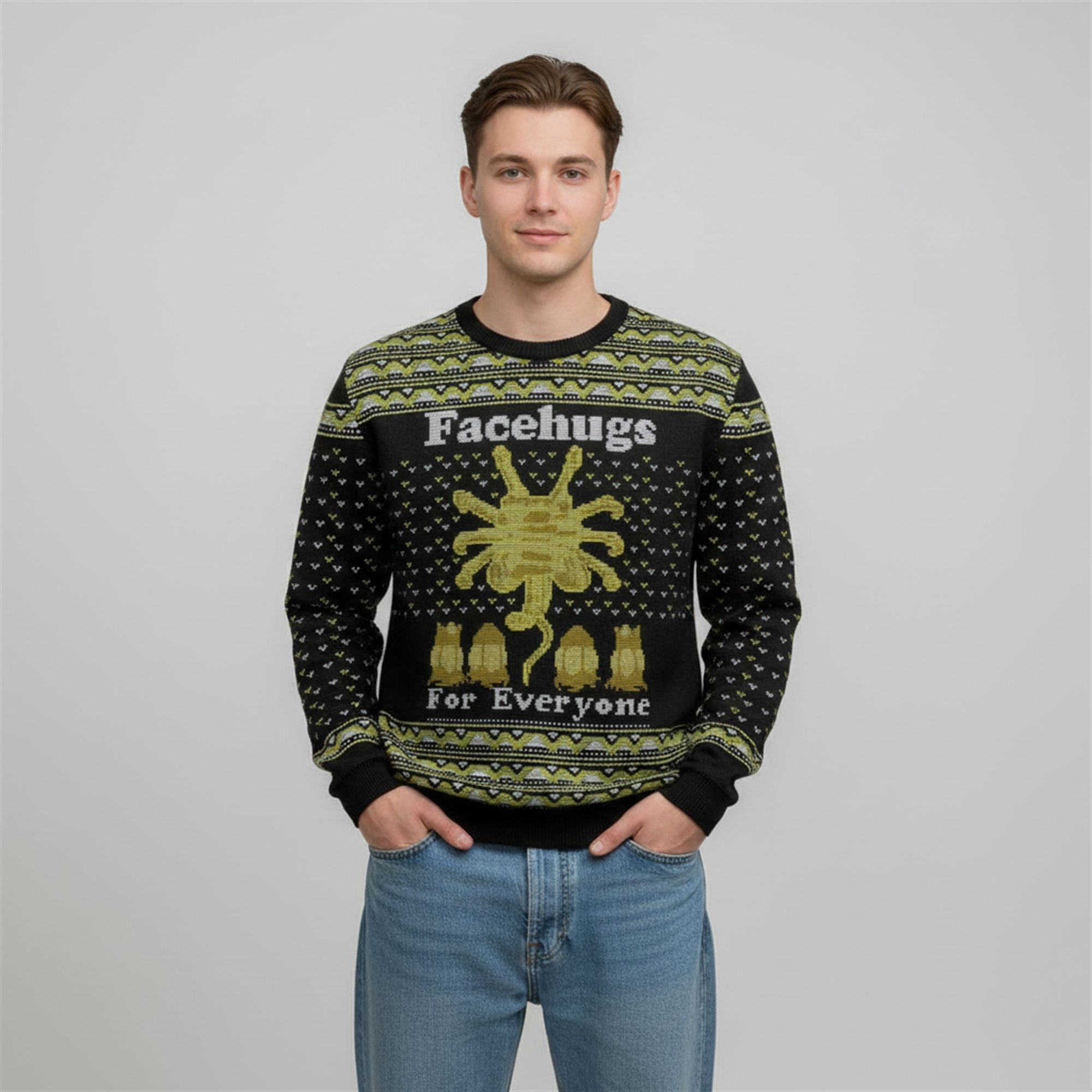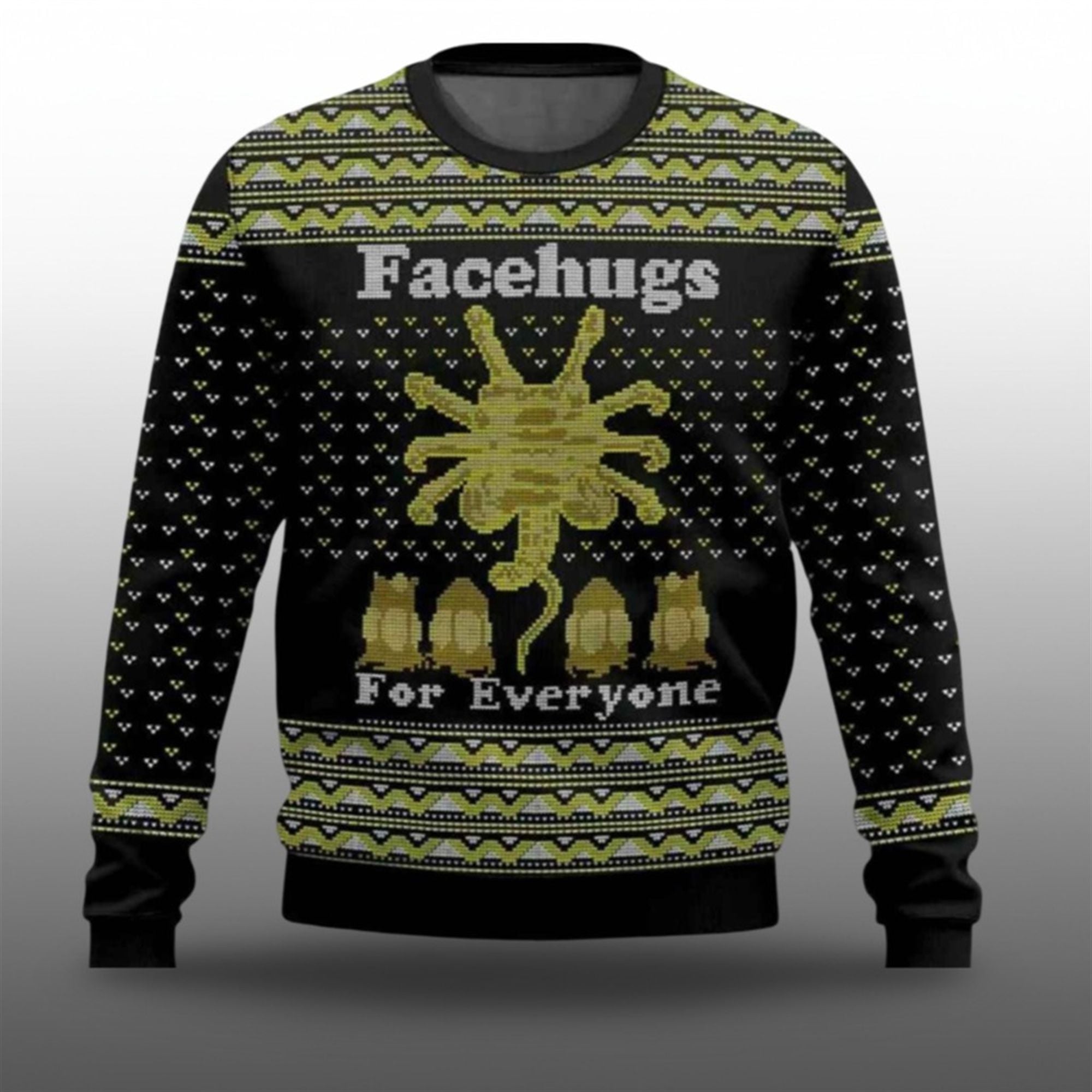 Set against a deep space-black background, the sweater showcases striking yellow and grey geometric patterns. However, look closer, and the “festive” details reveal a darker truth. The centerpiece is a sprawling Facehugger, arms wide open, ready to embrace the wearer in a terrifying hug. Below the creature sits a row of hatched and unhatched Alien eggs, completing the lifecycle of holiday horror. The bold text, “Facehugs For Everyone,” adds a layer of ironic humor that fans of Ridley Scott’s universe will instantly appreciate.