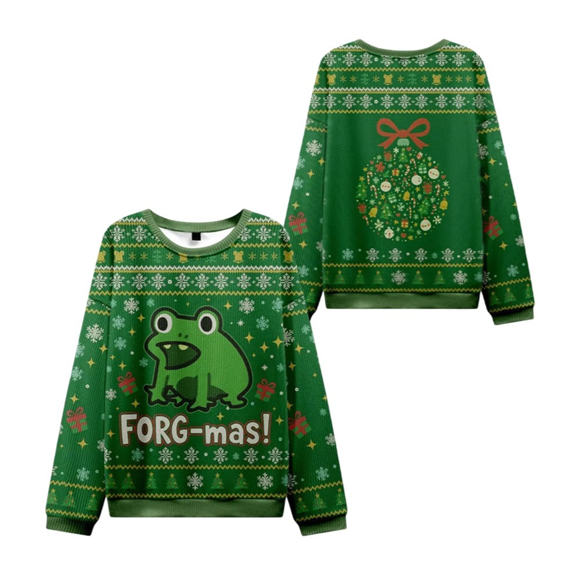 The “FORG-mas” sweater is designed to help you stand out. The front features a large, charmingly illustrated frog above the playful text “FORG-mas!”, a clever pun that will be an instant hit with anyone familiar with internet culture. The high-resolution graphic mimics the texture of a real knit sweater, complete with intricate details like snowflakes on the sleeves and classic Nordic patterns along the collar and cuffs. But the fun doesn’t stop there! The back of the sweater showcases a beautifully designed Christmas ornament filled with tiny festive icons and topped with a bright red bow, ensuring you look fantastic from every angle.