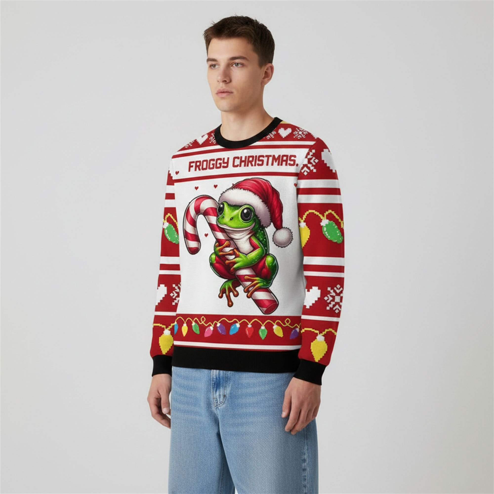 Step into Christmas 2025 with a look that is equal parts adorable and hilarious. The Froggy Christmas Ugly Sweater is not just a piece of clothing; it’s a mood. This eye-catching garment reimagines traditional holiday aesthetics by replacing the standard winter fauna with a wide-eyed, festive frog. The centerpiece of the design—a lovable green frog wearing a Santa hat and hugging a giant candy cane—is set against a classic “Fair Isle” inspired background of pixelated snowflakes, hearts, and Christmas lights. It’s a nostalgic nod to retro gaming graphics mixed with the warmth of modern holiday fashion.