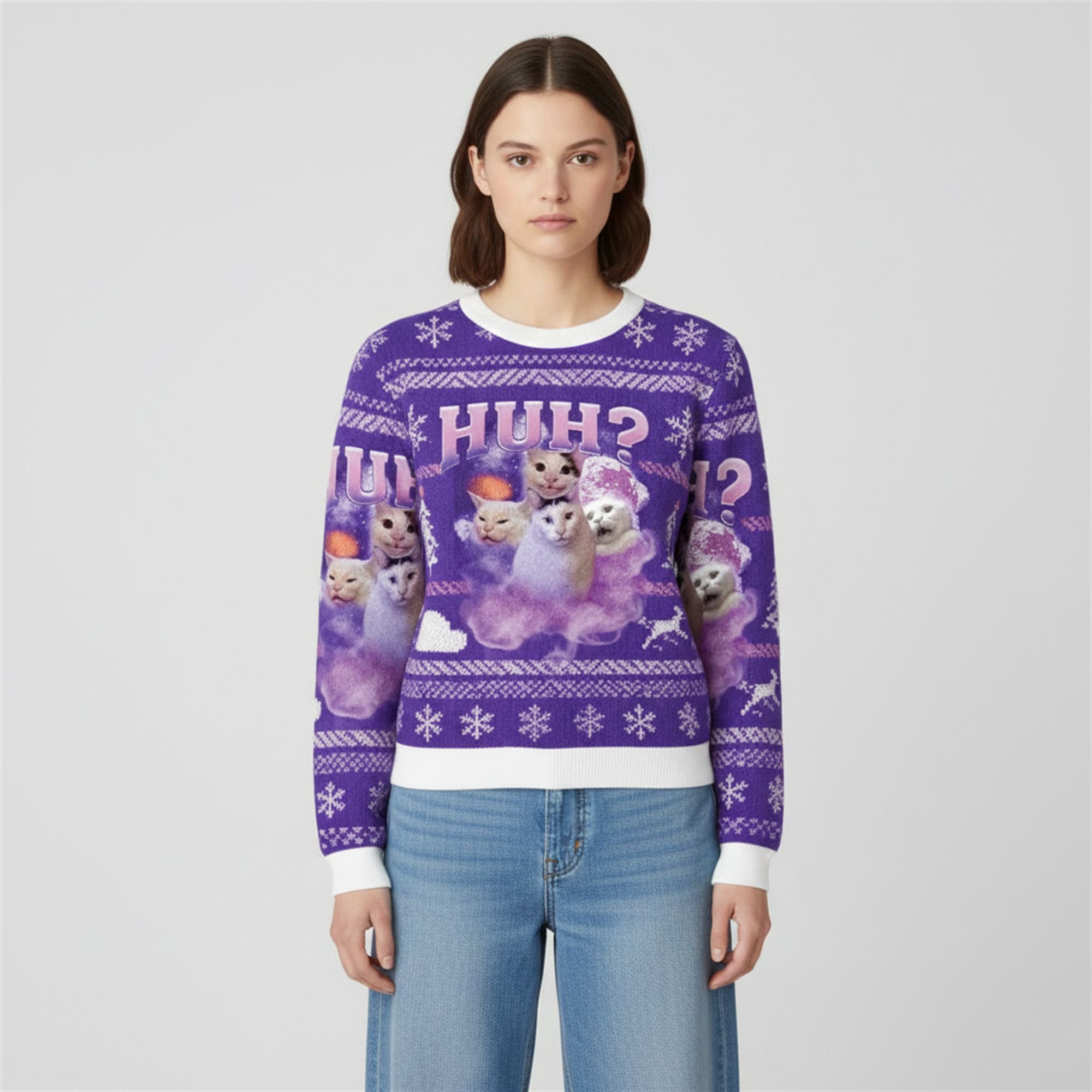 The holidays are chaotic, loud, and often confusingājust like the “Huh?” cat. This sweater captures the zeitgeist of 2025 internet humor, bringing the viral sound bite to life in fashion form. The design features a high-definition, all-over print of the famous confused cat, surrounded by a “mystical” purple fog and bold “HUH?” text.