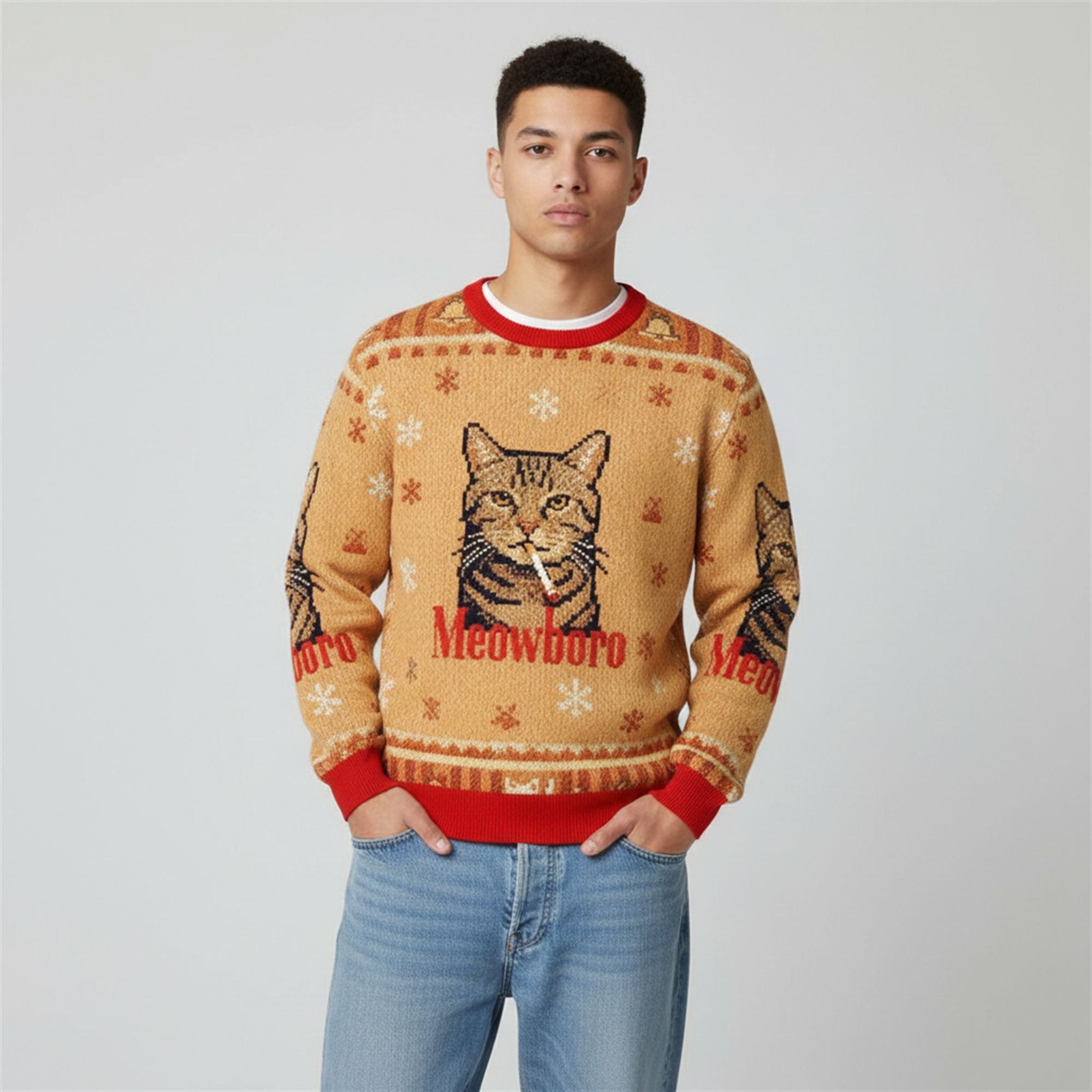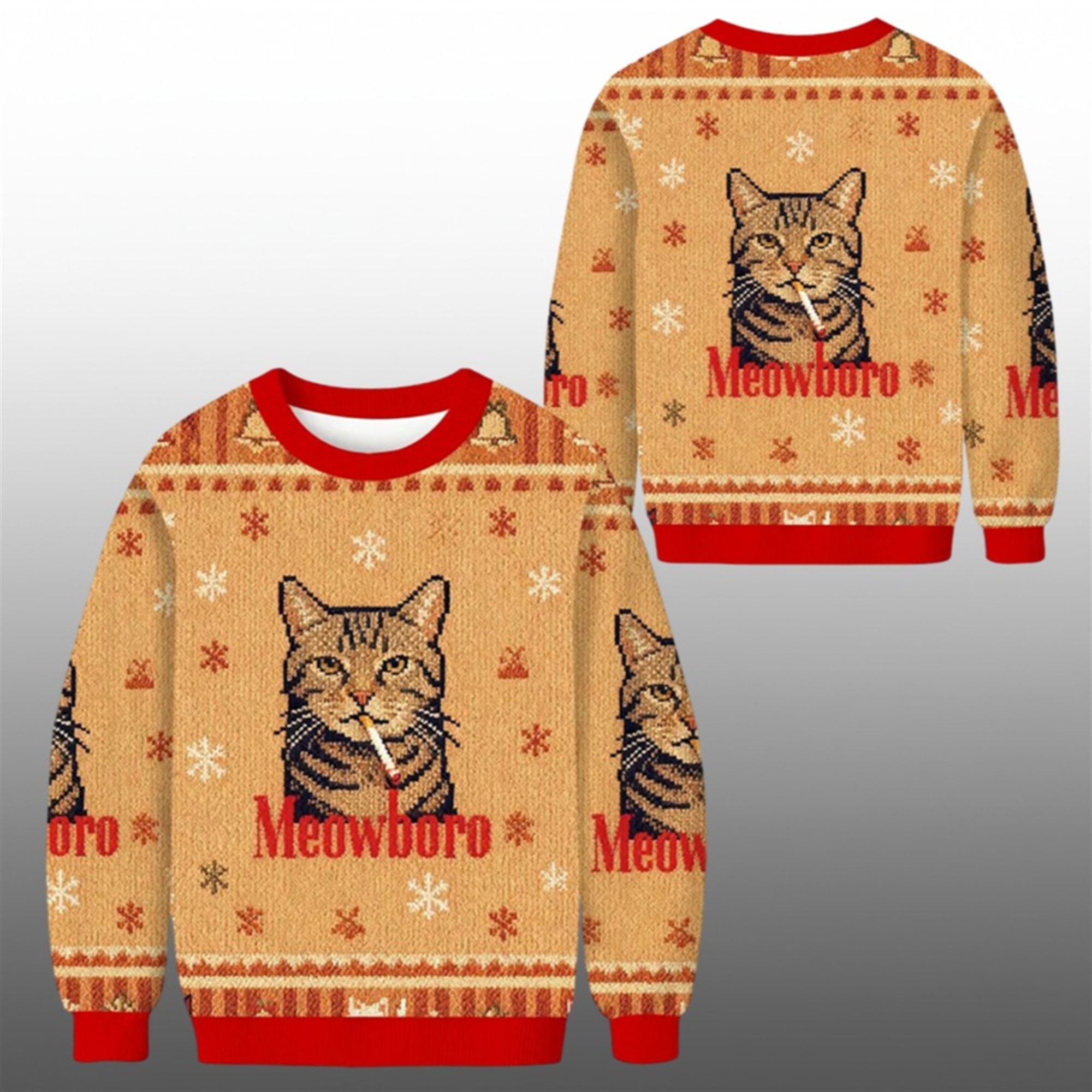 The sweater mimics the classic “ugly sweater” aesthetic with a faux-knit background pattern in a vintage beige/tan hueāreminiscent of retro parchment or tobacco packagingāaccentuated by festive snowflakes. The bold red collar, cuffs, and hemline pay homage to the iconic branding of the “flavor country” era, while the text “Meowboro” sits proudly in that instantly recognizable serif font.
