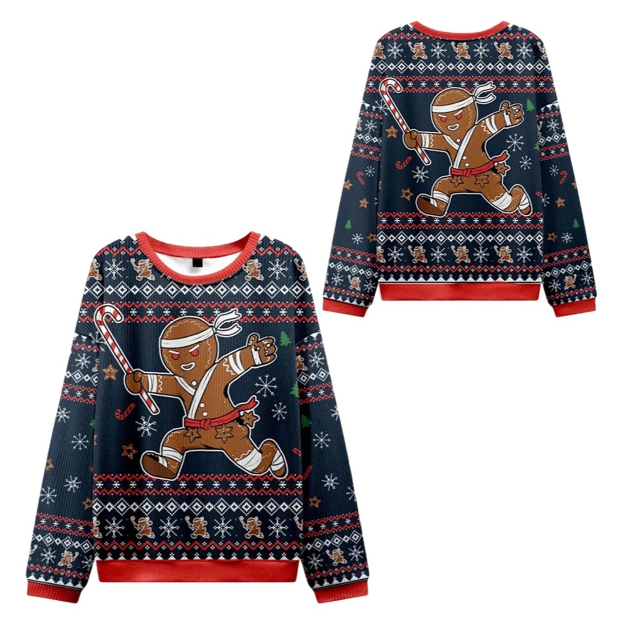 This sweater is a masterpiece of holiday humor and pop-culture coolness. The star of the show is our heroic Gingerbread Man, but he’s shed his timid, bite-me attitude. Re-imagined as a fierce Japanese warrior, he’s in a dynamic martial arts pose, complete with a warrior’s headband and a determined expression.