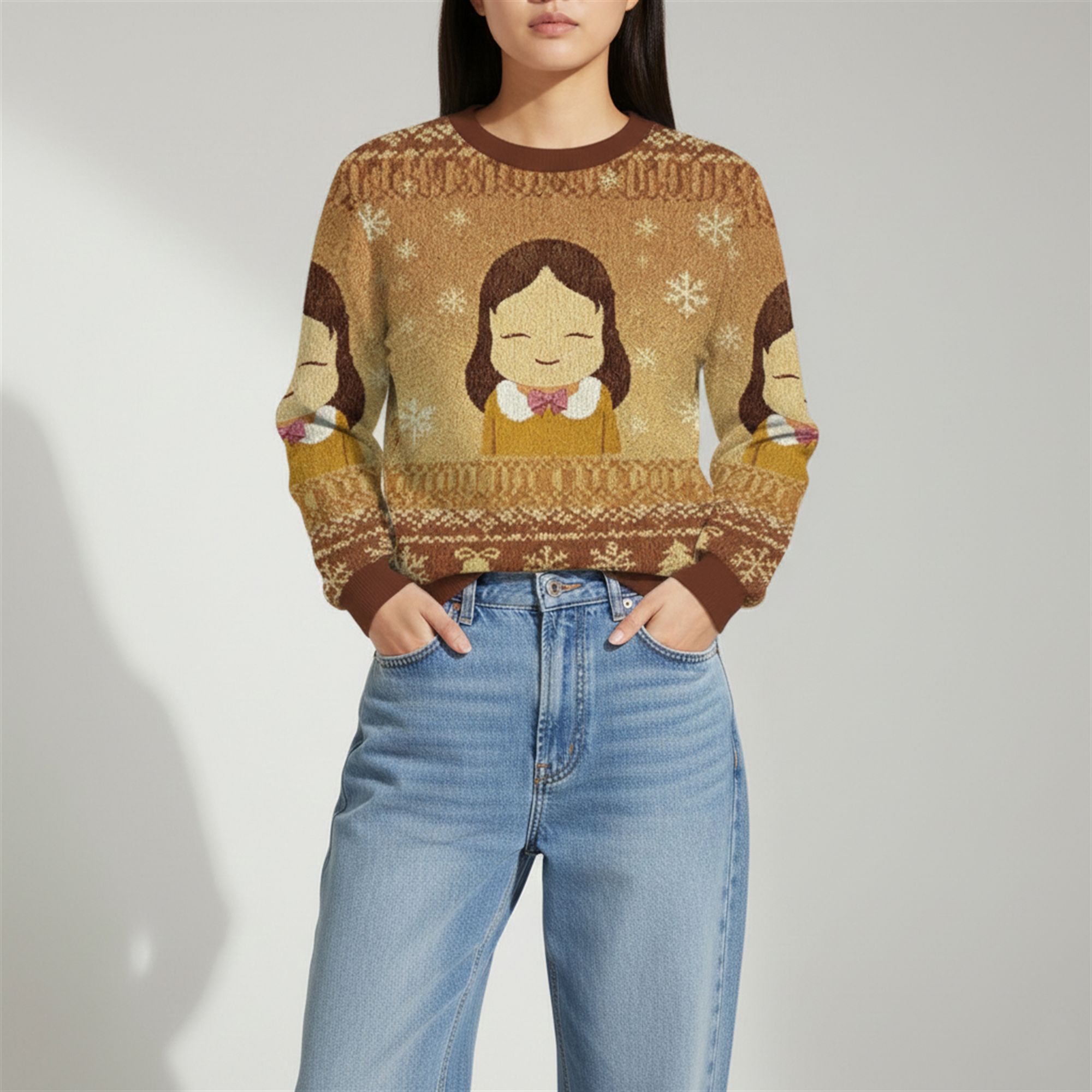 This 2025 holiday season, skip the stress and embrace the calm. Our Zen Doll Ugly Christmas Sweater reimagines the world’s most famous “Red Light, Green Light” character in a rare moment of peace. Gone is the terrifying stare; in its place is a wholesome, happy expression that signals “Green Light” all the way. Set against a toasted gingerbread-colored background with faux-knit fair isle patterns featuring snowflakes, bells, and pine trees, this sweater perfectly blends viral pop-culture menace with adorable festive cozy vibes.