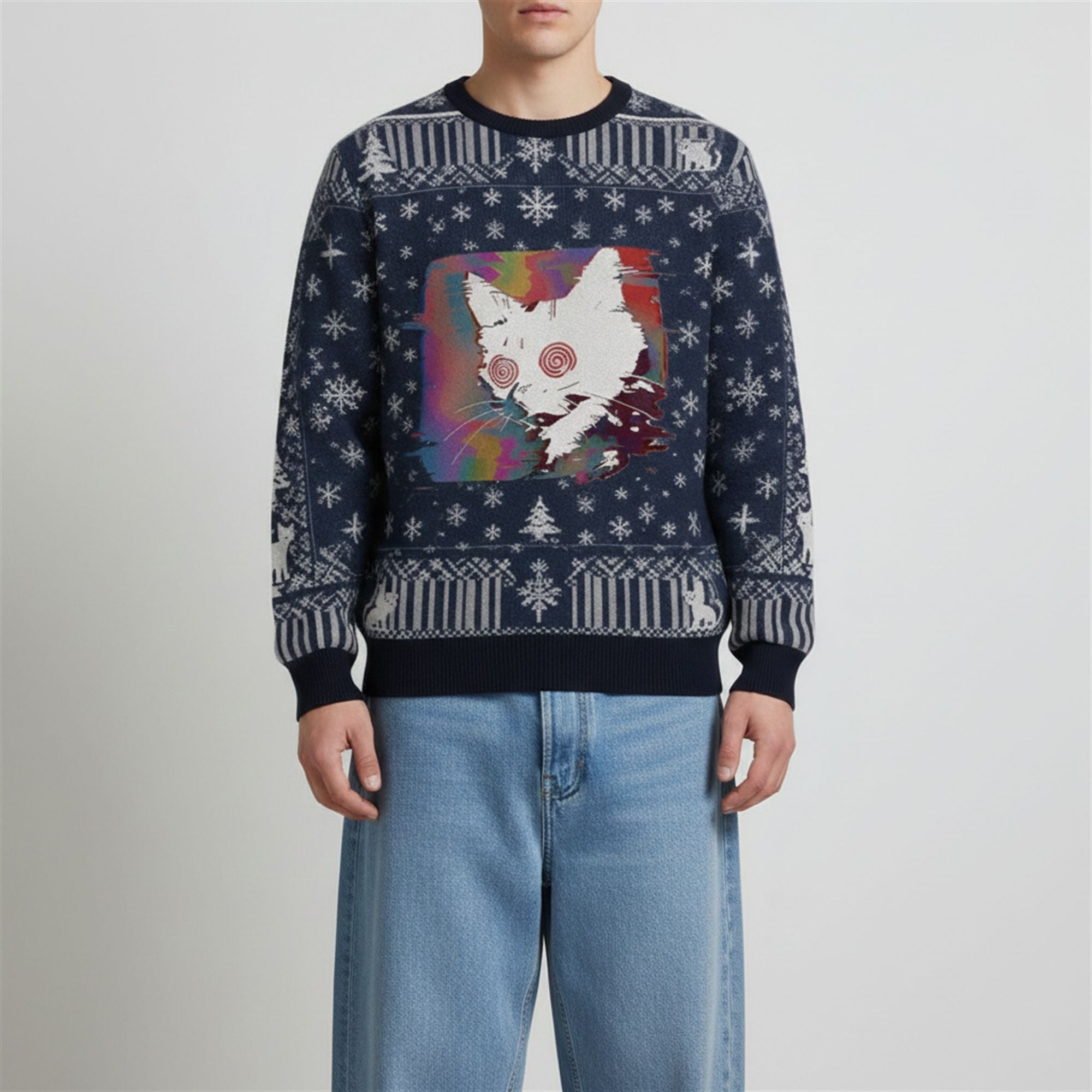 Forget the boring reindeer and generic Santa patterns this year. The Glitch Cat Ugly Christmas Sweater is here to disrupt the holiday status quo. Designed for those who live at the intersection of internet culture and festive tradition, this sweater features a disorienting, hypno-spiral cat set against a datamoshed background.