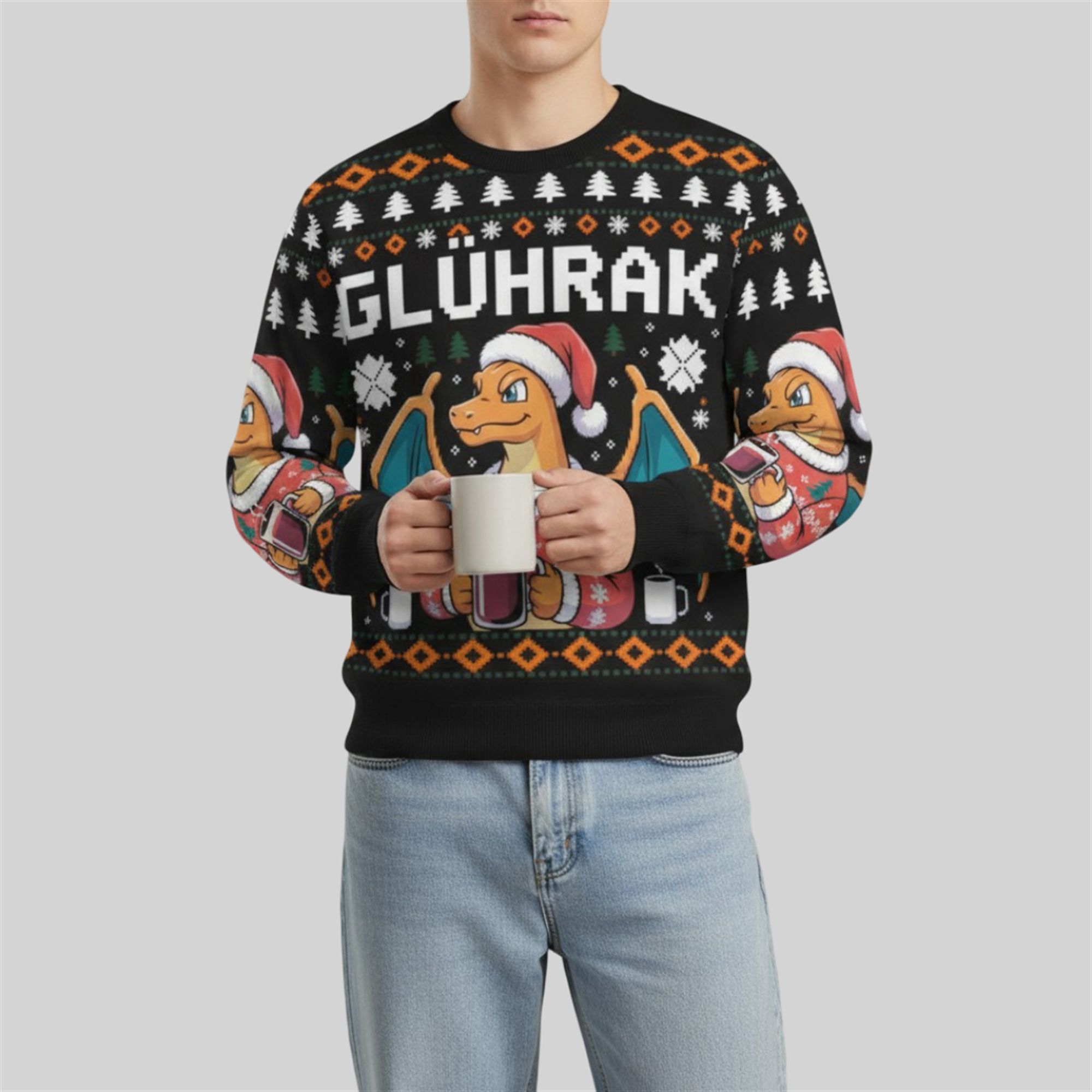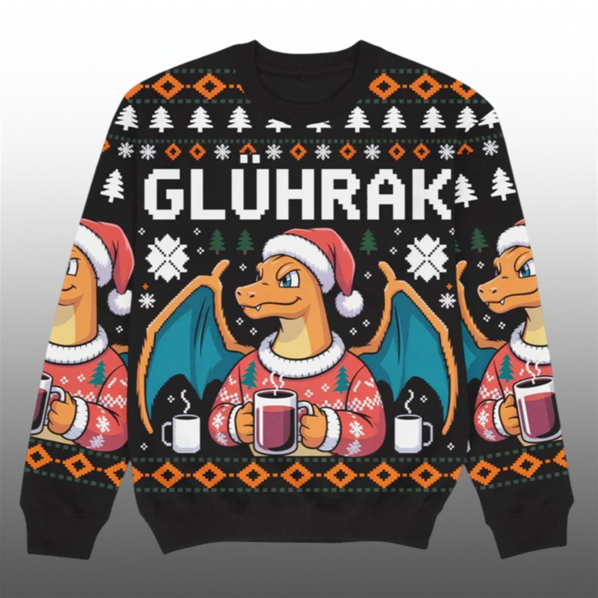 The text “GLÜHRAK” emblazoned across the chest is a brilliant linguistic pun. In German, this famous fire lizard is known as “Glurak.” By tweaking the spelling to include “Glüh” (from Glühwein, the beloved German mulled wine), this design transforms a battle-hardened monster into the cozy patron saint of holiday beverages. Set against a classic black background with orange and white Fair Isle patterns, pixelated trees, and snowflakes, this sweater perfectly balances “ugly” sweater tradition with modern geek culture.