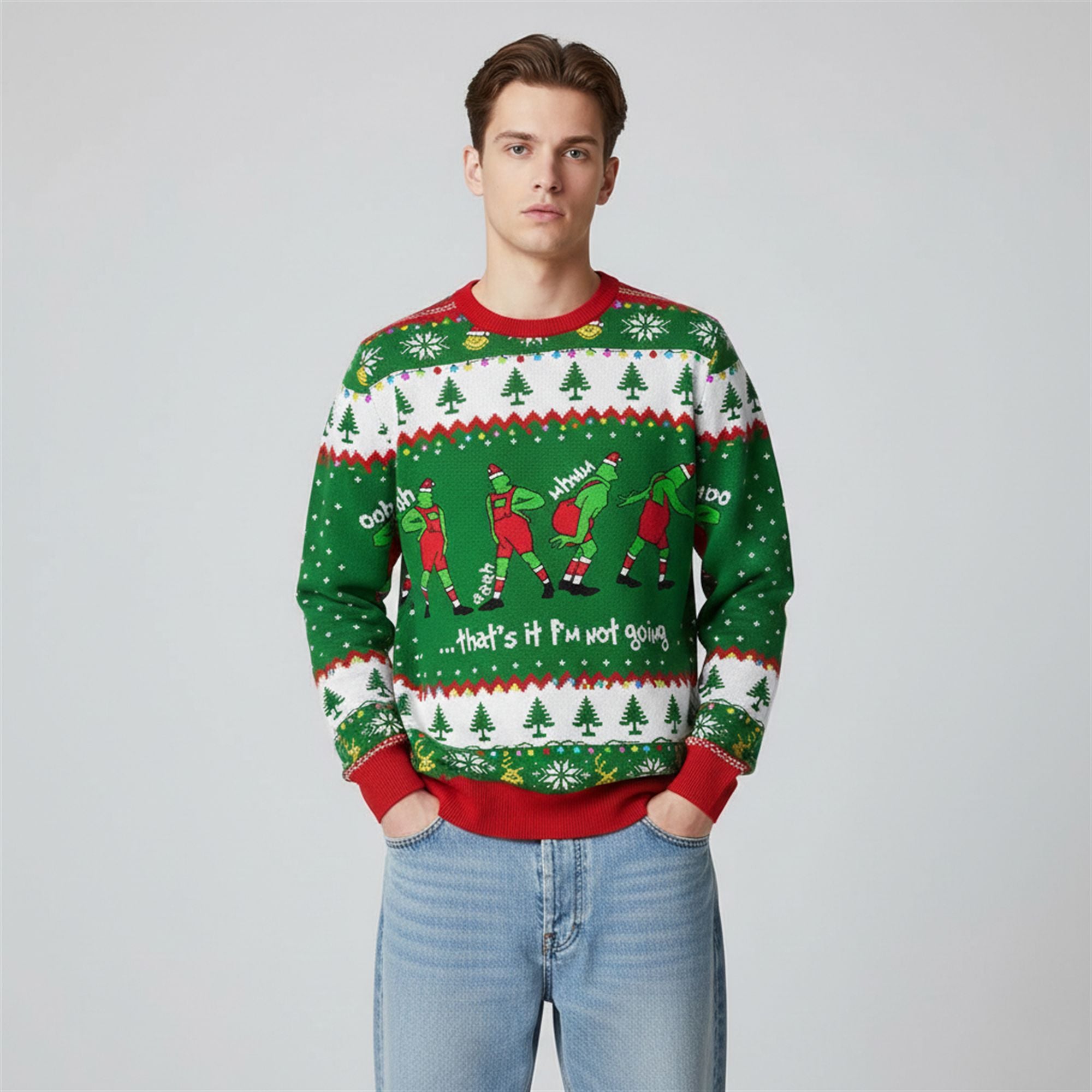 Capture the true spirit of your inner introvert this holiday season with the That’s It I’m Not Going”Ugly Christmas Sweater. This isn’t just a piece of clothing; it’s a boundary-setting statement piece for anyone who finds the holiday hustle a little too overwhelming. Featuring the world’s most famous holiday cynic in a series of hilarious, dramatic poses—strutting, posing, and turning his back on the festivities—this sweater perfectly encapsulates the iconic “I’m not going” tantrum from the classic Jim Carrey movie.