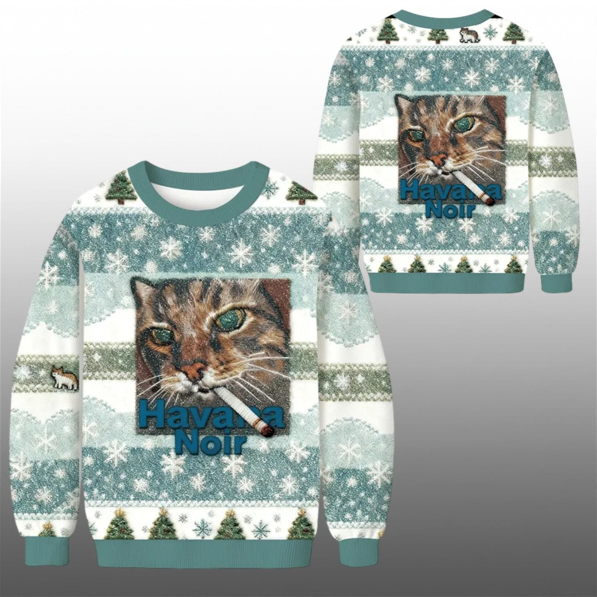 2025 Christmas Havana Noir Cat Cigarette Ugly Sweater | Funny Gen Z Holiday