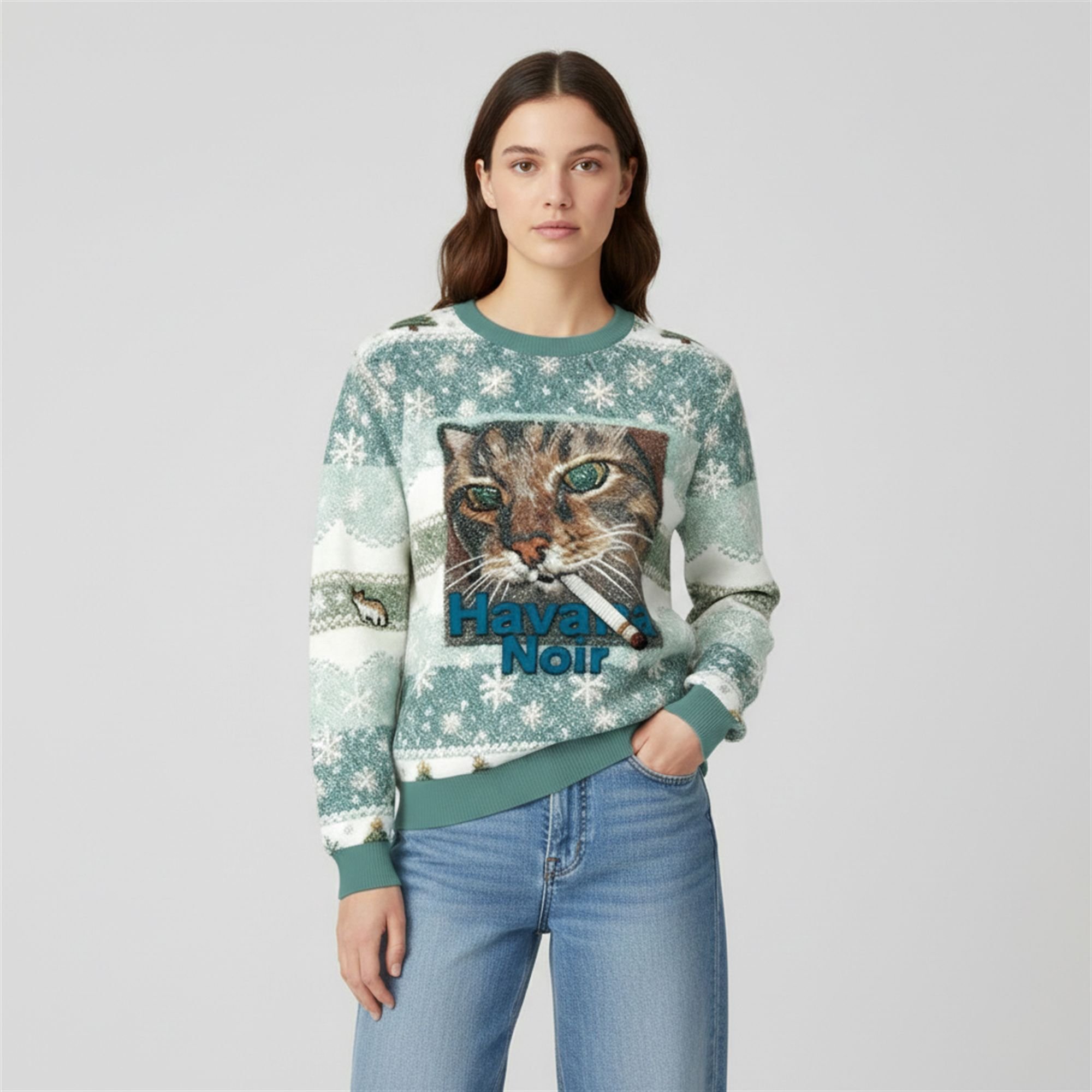 The centerpiece of the design is a beautifully rendered, high-definition graphic of a tabby cat with piercing green eyes, nonchalantly smoking a cigarette. The text “Havana Noir” is emblazoned below in a bold, retro font, evoking the style of vintage Cuban cigar ads or gritty 1950s detective movies. This edgy center image is framed by a traditional “ugly sweater” fair isle pattern featuring snowflakes, evergreen trees, and subtle pixelated cats, creating a jarringly funny contrast between cozy holiday vibes and “hard” street energy.