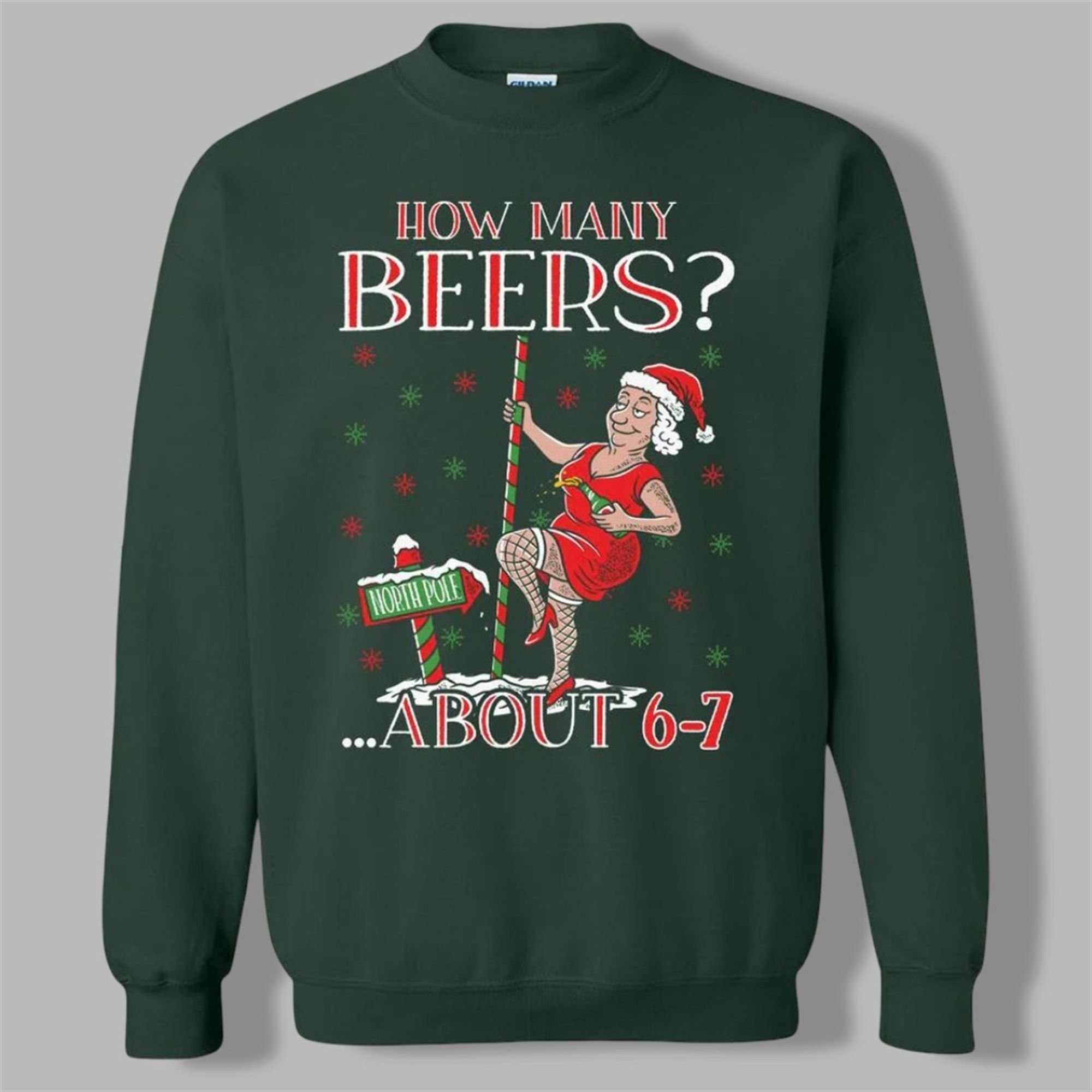 This holiday season, raise a glass (or a can) to the funniest, most relatable sweater of 2025. Introducing the How Many Beers? About 6-7 Ugly Sweater. This dark green sweater isn’t just clothing; it’s a badge of honor for the holiday enthusiast who truly knows how to have a good time. The design is an instant classic: a festively tipsy grandma or Mrs. Claus, complete with a Santa hat and a beer in hand, showing off her hilarious moves on the “North Pole.”