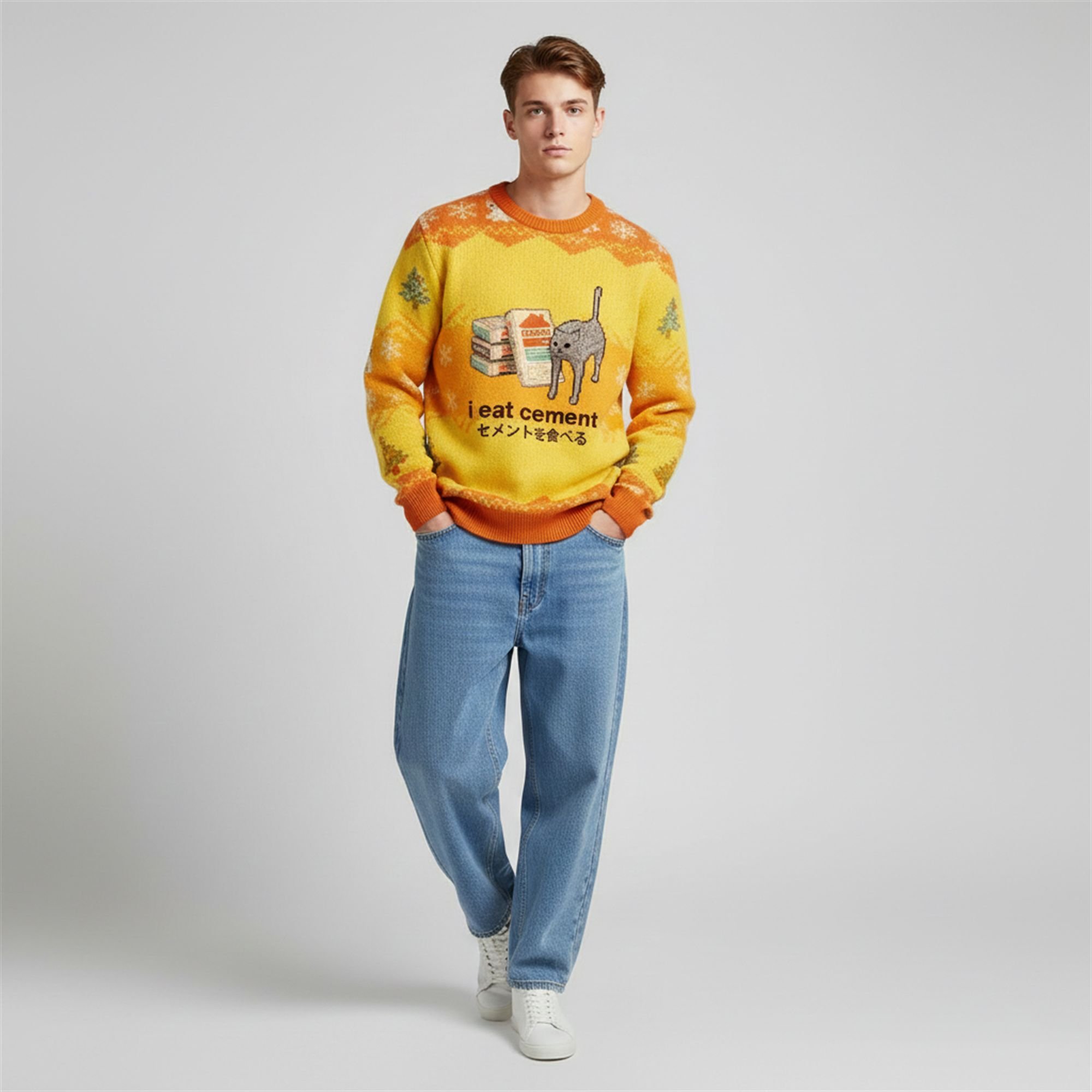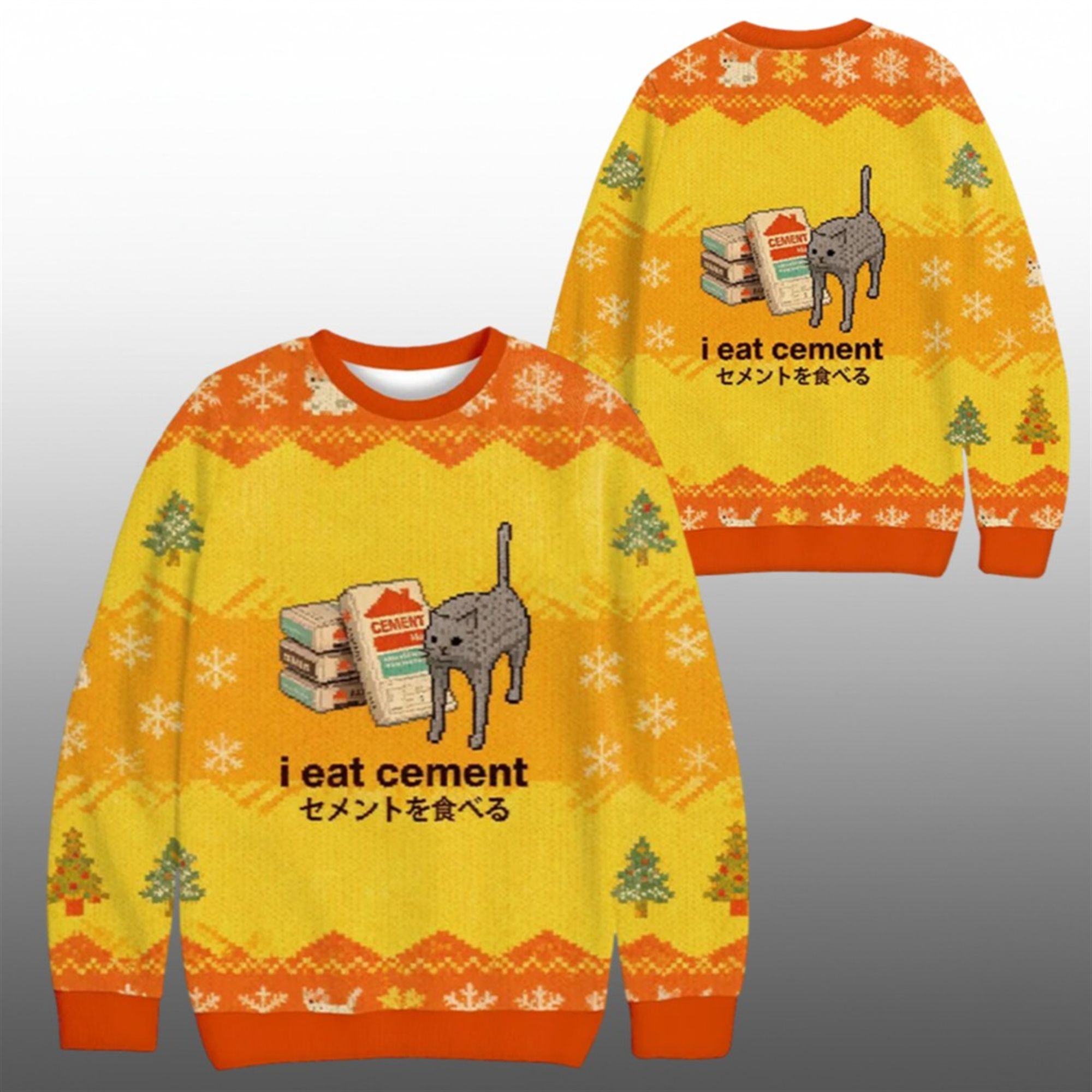 Forget generic snowflakes and boring Santa Claus designs. The I Eat Cement Cat Ugly Christmas Sweater is a masterpiece of internet culture brought to life. The design centers on the beloved viral grey cat, rendered in nostalgic pixel art style, casually feasting on bags of “Cement Mix.” The absurd English caption is paired with authentic Japanese text (セメントを食べる), adding an layer of aesthetic irony often found in high-end streetwear and vaporwave fashion. Set against a vibrant “construction safety” yellow and orange background, this sweater mimics the traditional “knit” look with a digital fair isle pattern of trees and snowflakes, creating a jarringly hilarious contrast that defines the “cursed image” genre.