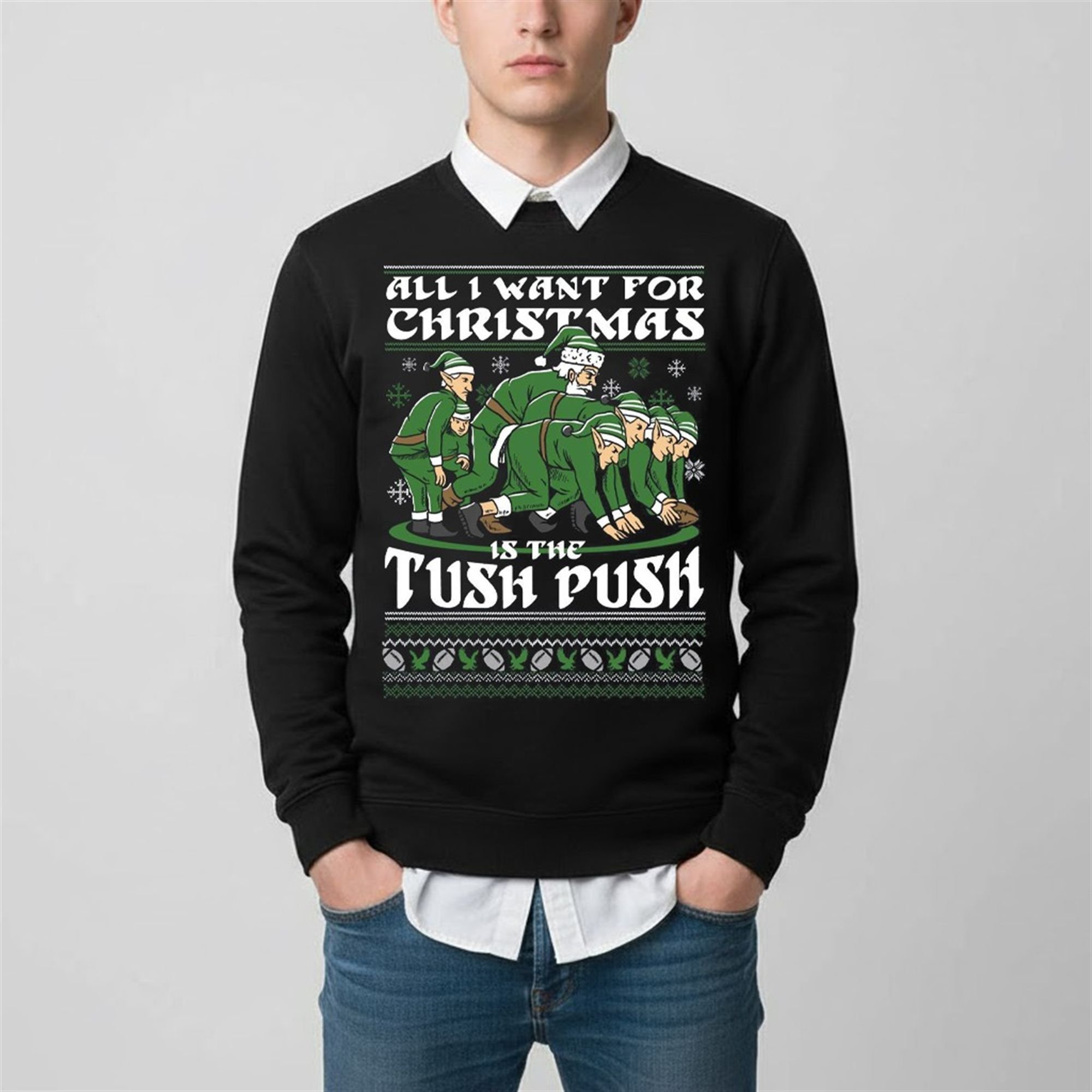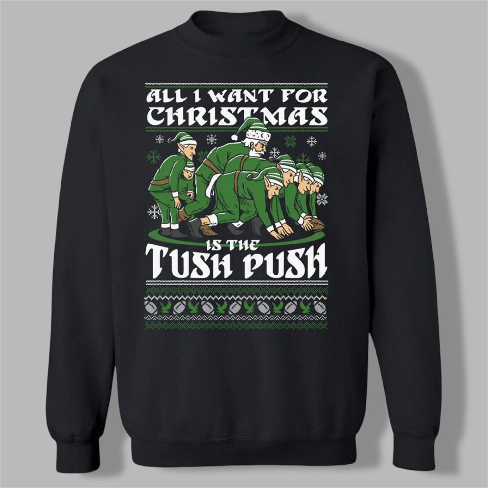 The design is an instant classic. Front and center, a team of determined elves in green uniforms executes the “Brotherly Shove” with holiday precision. One elf, playing quarterback with a festive Santa hat, gets the game-winning push from his teammates, all determined to get that crucial “first down” before Christmas morning. The bold text “All I Want For Christmas Is The Tush Push” says it all, capturing the one wish on every true fan’s list. Framed by a traditional “ugly sweater” knit patternâcomplete with snowflakes and footballsâthis design perfectly merges holiday cheer with hardcore fan spirit.