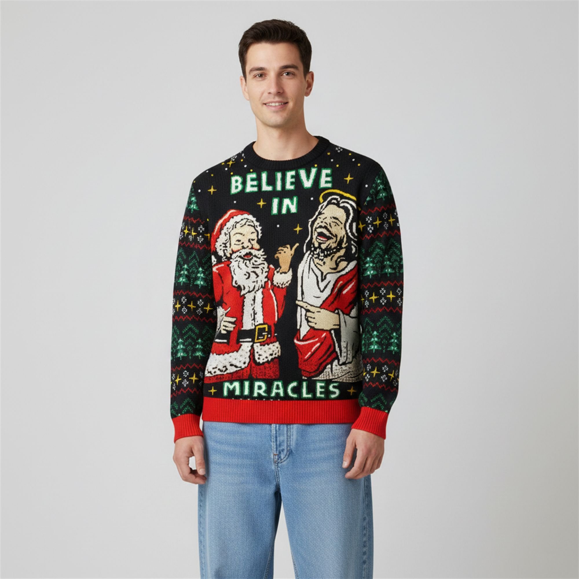The design features a vibrant, high-definition graphic set against a classic black backdrop. It showcases a laughing Santa Claus pointing at a joyous Jesus, with the text “BELIEVE IN MIRACLES” emblazoned in bold, festive lettering above and below them. Surrounding the duo are traditional “ugly sweater” motifs, including pixelated Christmas trees, stars, and geometric patterns, giving it that nostalgic, hand-knit aesthetic while utilizing modern printing technology for lasting color.