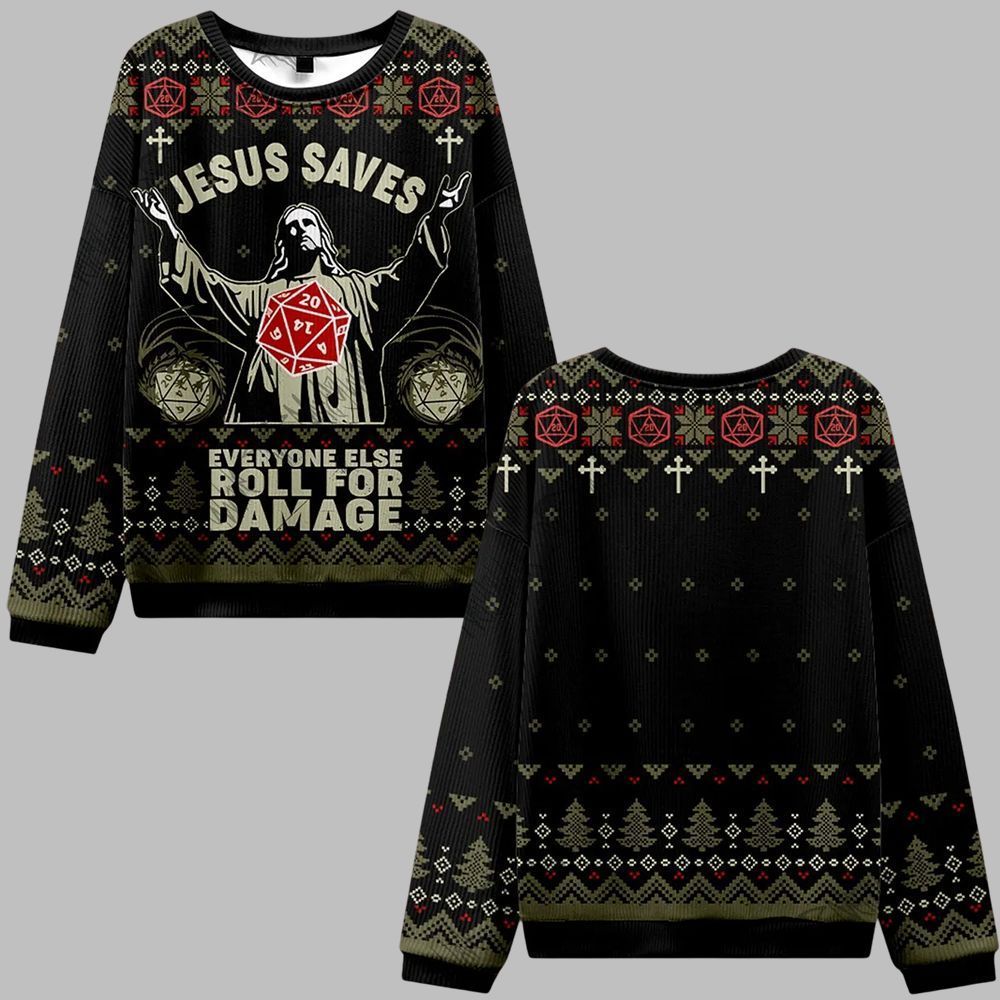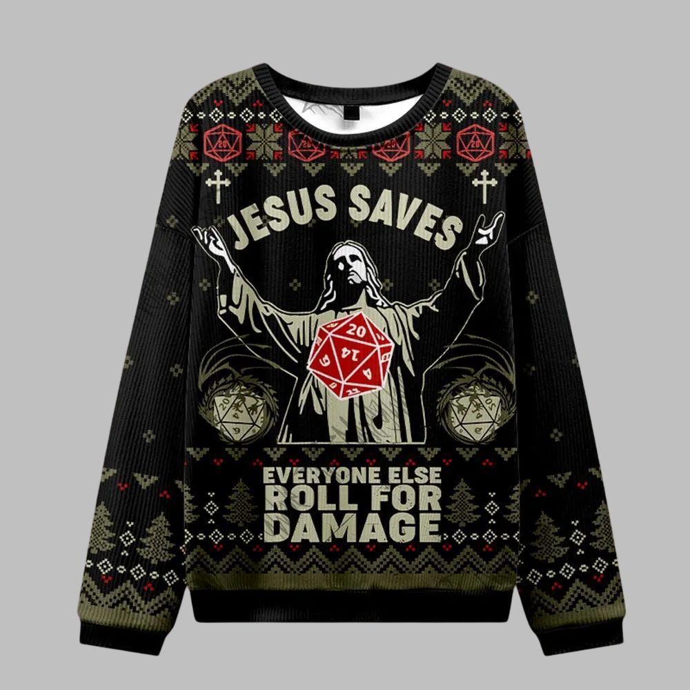 2025 Christmas Jesus Saves Everyone Else Roll for Damage Ugly Christmas Sweater | Win the Holiday Encounter