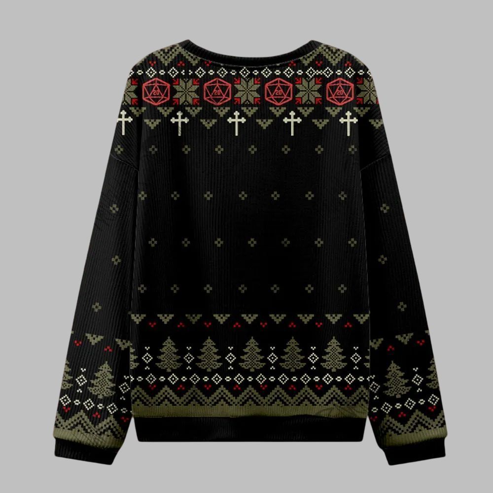 The design is framed by intricate, game-inspired iconography and flanked by dragon-like silhouettes, adding a layer of epic fantasy to the divine comedy. The sleeves and back continue the theme with a classic “ugly sweater” pattern of crosses, Christmas trees, and polyhedral dice, ensuring you look festive and geeky from every angle.