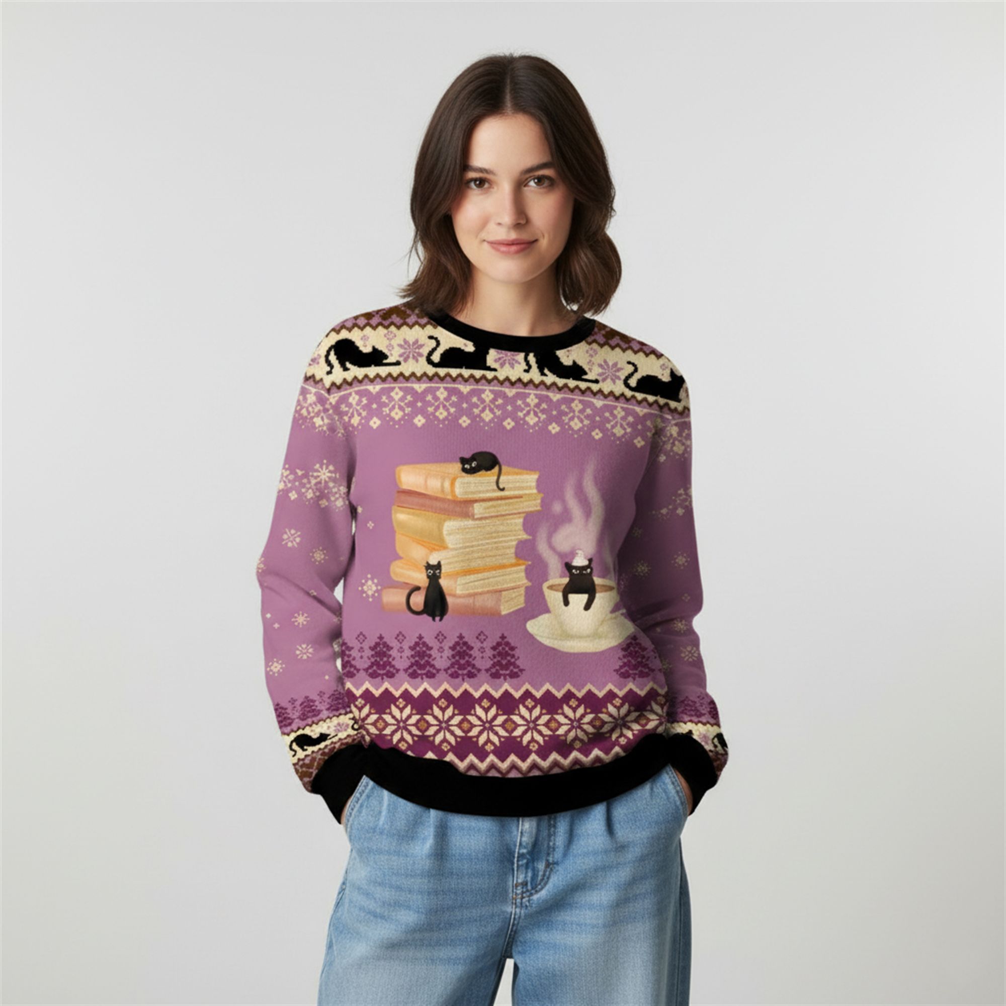 The design features a faux-knit “Fair Isle” pattern that cleverly integrates winter snowflakes, geometric Christmas trees, and playful silhouettes of black cats stalking across the shoulders and hemline. The centerpiece of the sweater is a charming illustration that every cat owner will recognize: a precarious stack of hardcover books being investigated by curious felines, accompanied by a cat mischievously sitting inside a steaming cup of tea (or perhaps coffee/hot cocoa).
