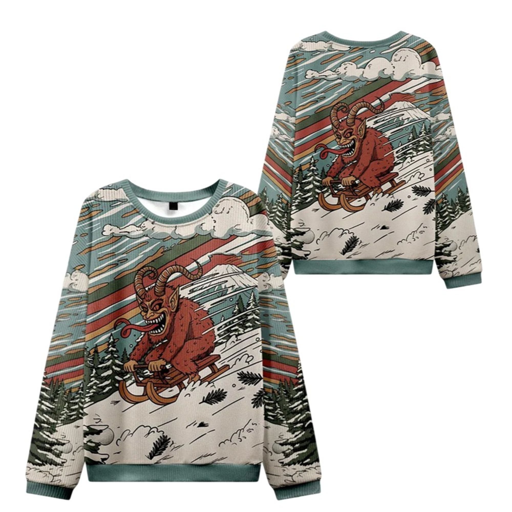 The centerpiece is Krampus himself, captured in a rare moment of joy (or perhaps malice) as he speeds down a snowy mountain on a rickety wooden sled. His horns are curled, his long tongue is out, and he’s ready to make this year’s naughty list the only place to be. The entire scene is rendered in a beautifully muted, retro color palette. Faded teals, deep rust-reds, and earthy browns are sliced through by a 1970s-style rainbow stripe across the sky, giving it a genuine “retro ski lodge” feel. This is the holiday sweater for those who find “jingle bells” just a bit too tame.