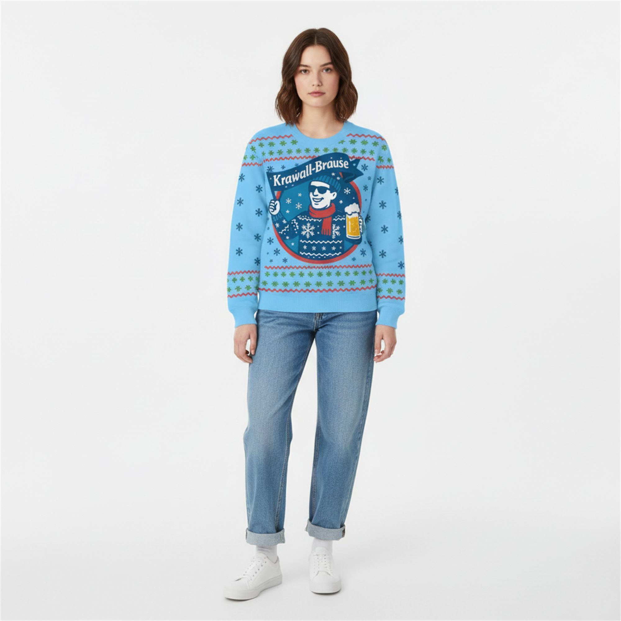 This sweater features a bold, light blue backdrop adorned with classic Nordic-style zig-zags and snowflakes, grounding the wild design in traditional holiday comfort. The centerpiece is a cool, stylized character rocking sunglasses, a beanie, and a scarf, triumphantly holding a foaming beer mug in one hand and a “Krawall-Brause” banner in the other. It’s the perfect fusion of winter coziness and unapologetic party energy.