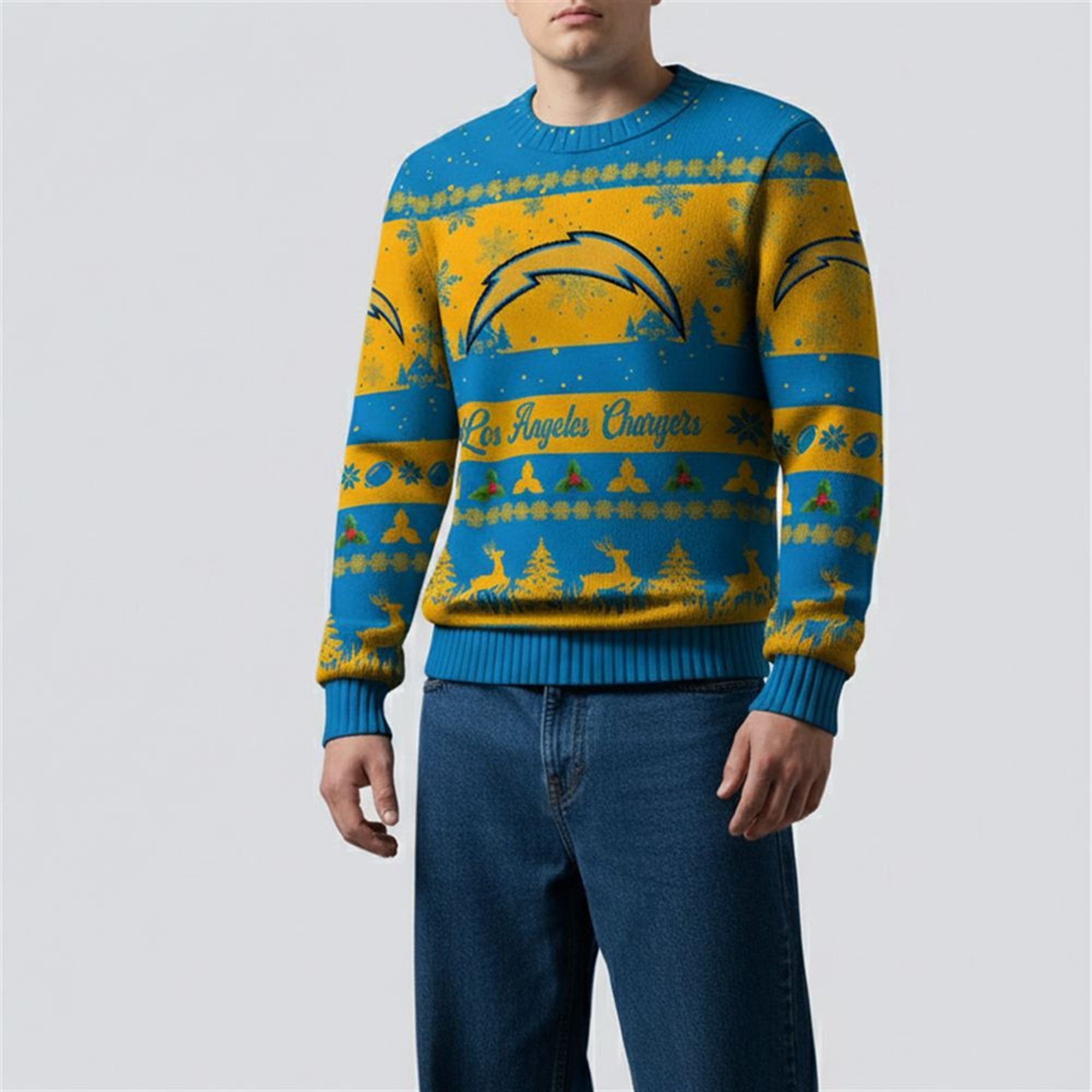 Surrounding the team insignia is a winter wonderland of classic Fair Isle patterns. We’ve integrated festive reindeer leaping through a forest of pine trees, but with a sporty twist—look closely, and you’ll see stylized footballs and geometric snowflakes woven into the intricate stripes. The vivid “Los Angeles Chargers” script across the chest and back proudly declares your allegiance, ensuring there is no confusion about which team owns your heart this Christmas.
