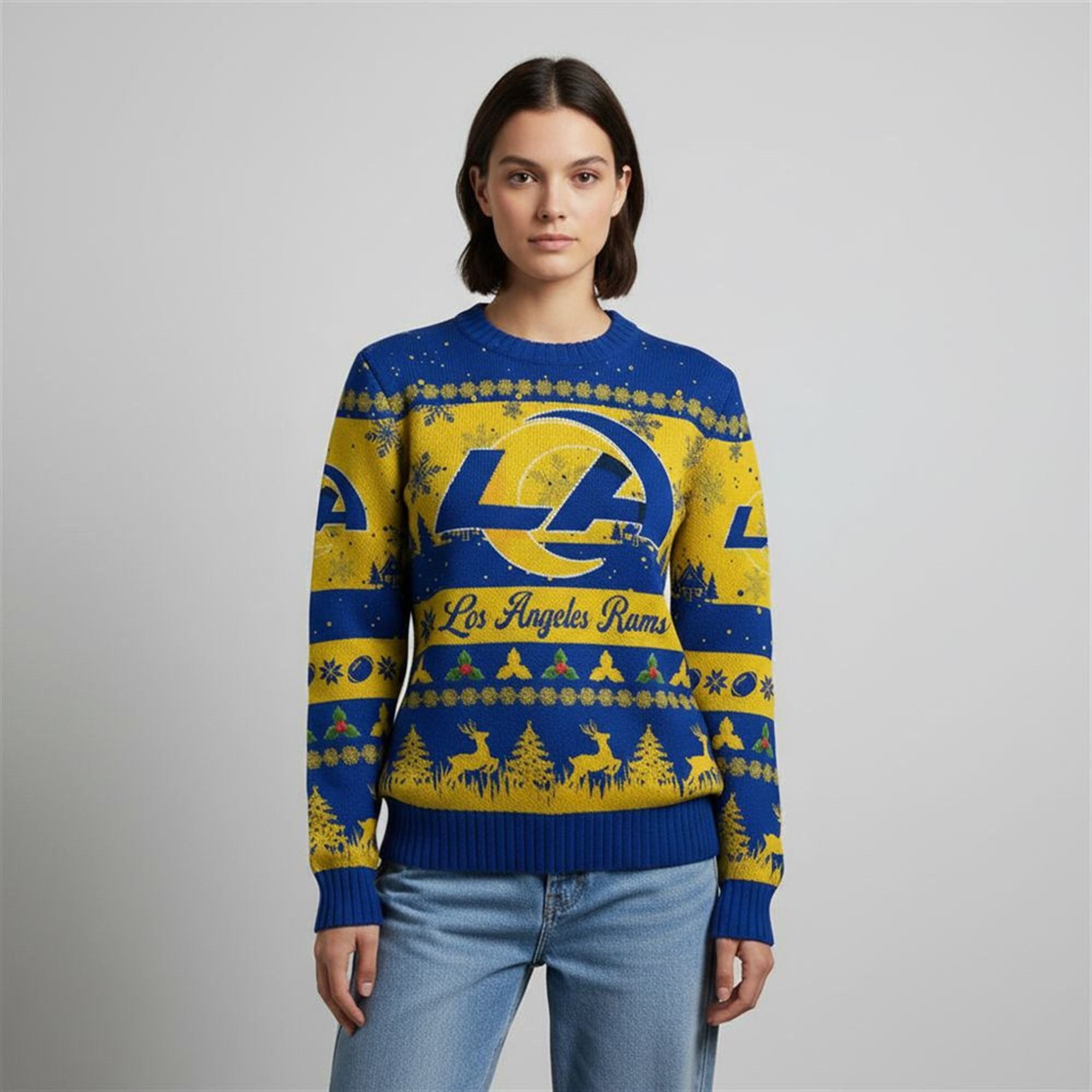 However, the centerpiece is undeniably the massive, vibrant LA Rams logo centered on the chest, highlighted by the signature golden horn. Below the logo, a classic script reads “Los Angeles Rams,” ensuring there is no confusion about where your allegiance lies. The backdrop is a rich, deep Royal Blue, accented by bands of Sol Yellow, perfectly mimicking the team’s on-field jerseys while adhering to the cozy aesthetics of traditional Christmas knitwear.