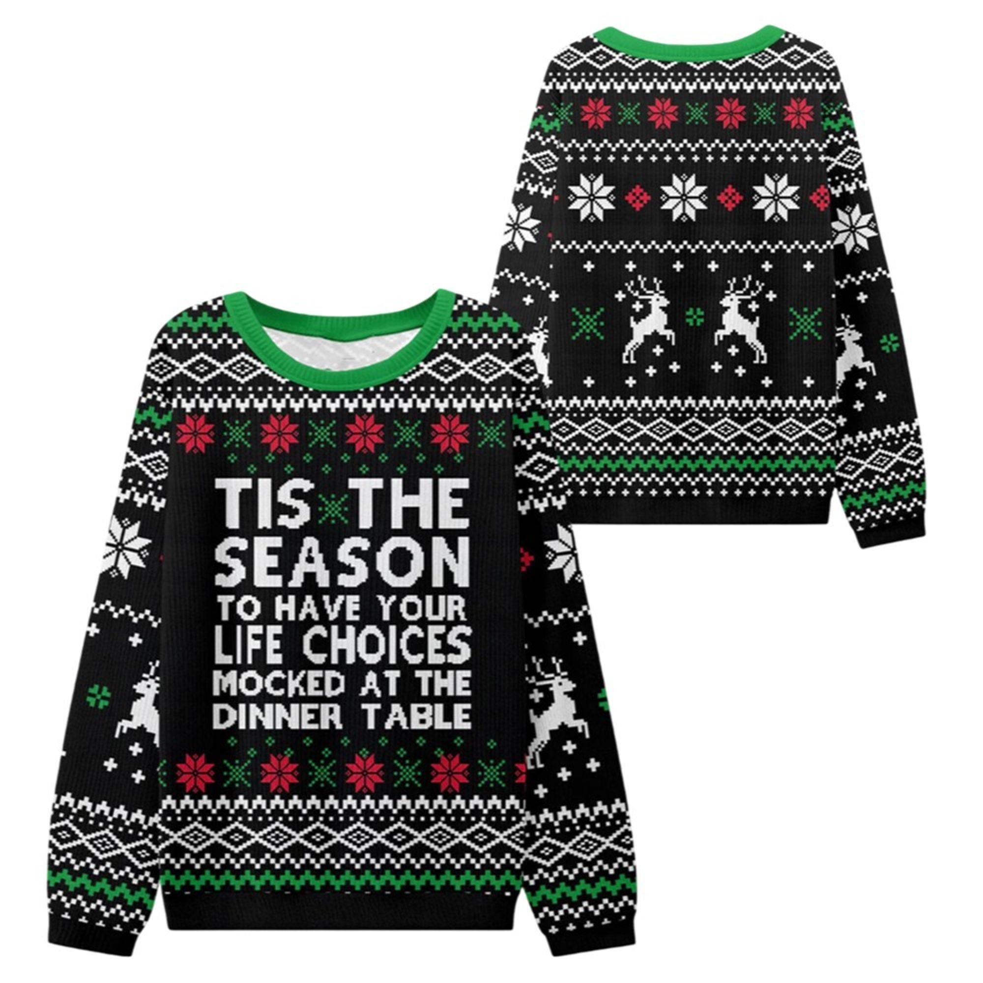Front Graphic: Dominating the front is the large, white, highly-legible text: “TIS THE SEASON TO HAVE YOUR LIFE CHOICES MOCKED AT THE DINNER TABLE.” Classic Holiday Accents: The text is surrounded by traditional holiday motifsâsnowflakes, reindeer, and geometric patternsâin eye-catching shades of green, red, and white. The green rib-knit collar adds a final pop of color.