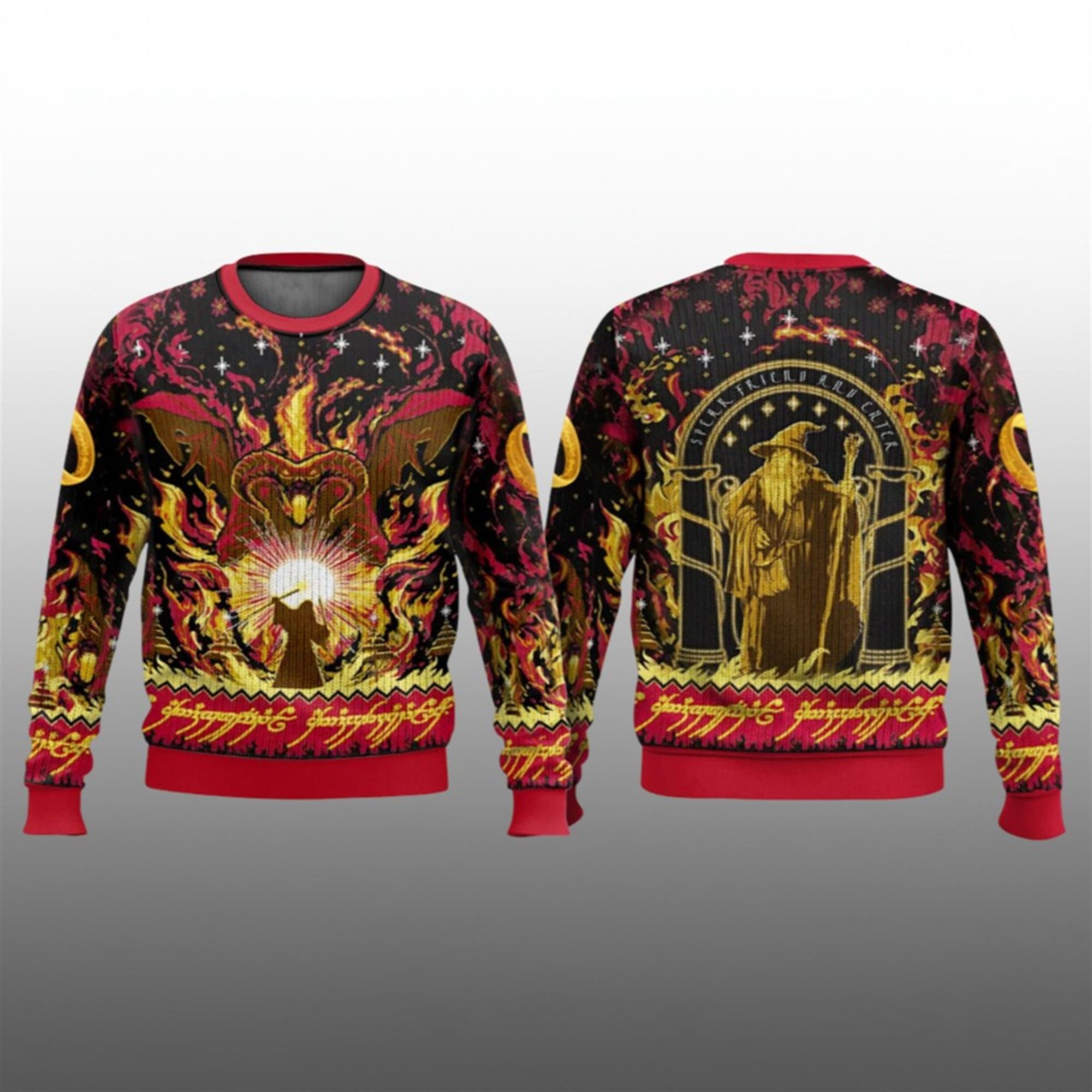 The front of the sweater features a dramatic, high-definition depiction of the Balrog of Morgoth spreading its wings of shadow and flame, towering over the grey pilgrim, Gandalf. The vibrant reds, oranges, and deep blacks contrast sharply against the festive season, making a bold statement. But the detail doesn’t stop there. The back of the sweater transports you to the entrance of Moria, showcasing Gandalf standing before the Doors of Durin under the moonlight, framed by the riddle “Speak Friend and Enter.”