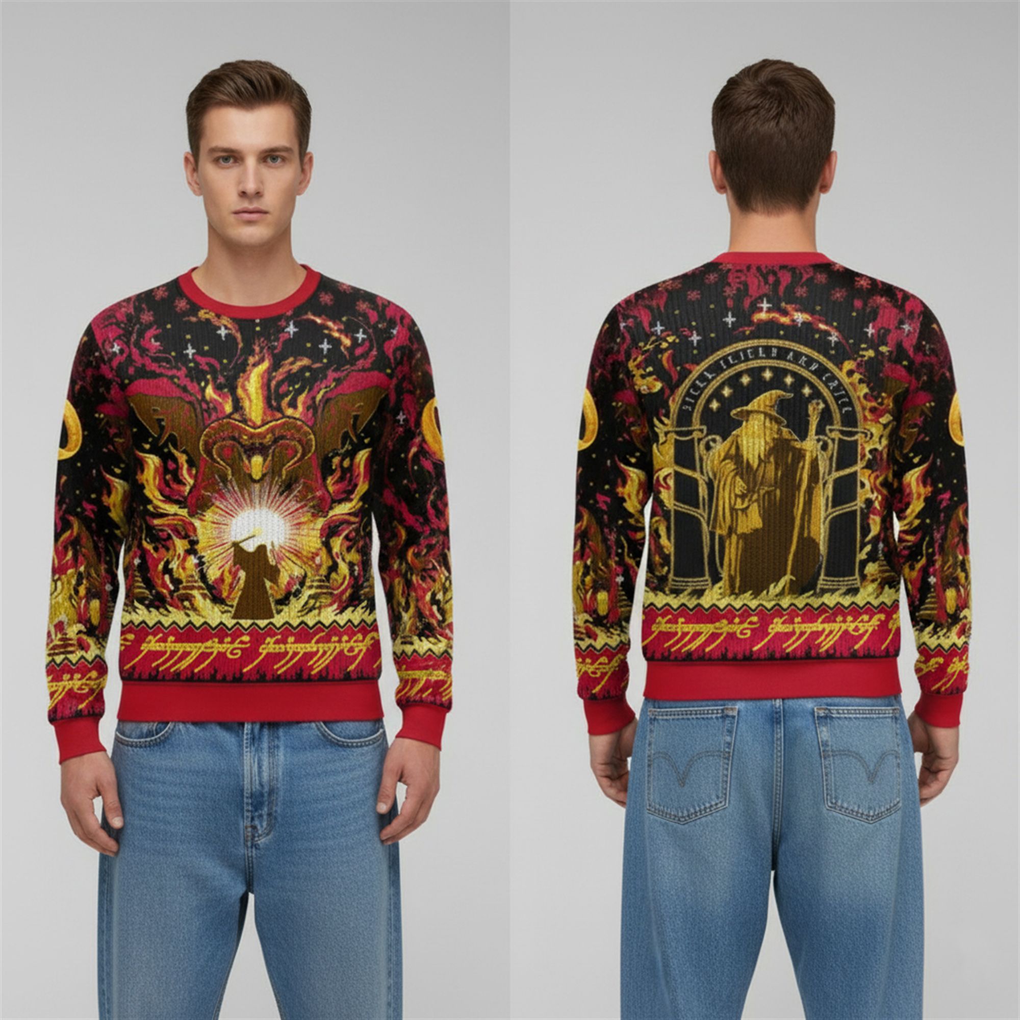 Step into the legend. The 2025 Christmas Lord Of The Ring Balrog Ugly Sweater is designed for the fan who knows that the journey doesn’t end at the Shire. This garment transforms the cozy tradition of the Christmas sweater into a canvas for high fantasy art.